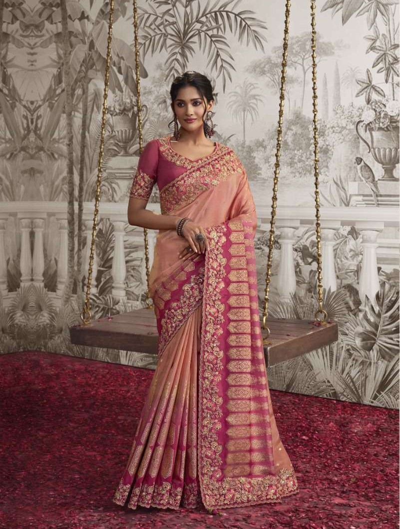 Radiate royal elegance with this breathtaking peach-pink designer saree, a flawless fusion of tradition and sophistication. Crafted from luxurious silk-blend georgette, it features rich zari and sequin embroidery that highlights intricate floral and geometric motifs. The vibrant dual-tone of peach and magenta creates a mesmerizing contrast, while the ornate border adds a regal finishing touch.Paired with a matching embroidered blouse, this saree is a perfect choice for weddings, receptions, or grand festive occasions—bringing timeless beauty to every celebration.