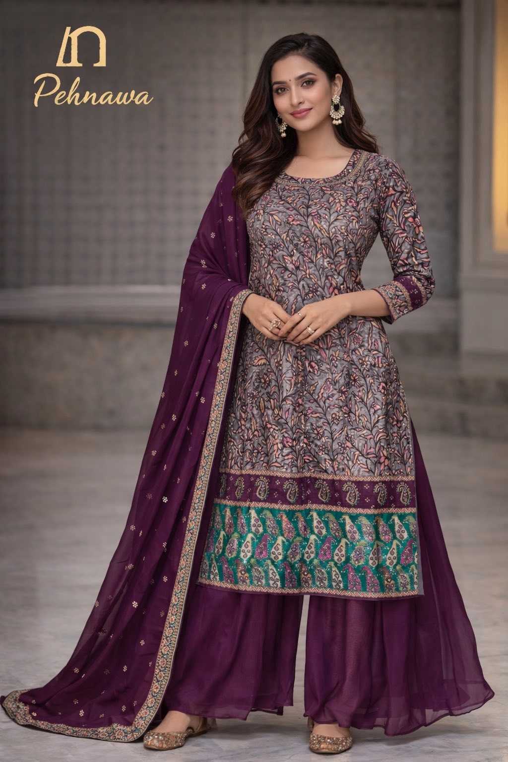 Printed Plum Palazzo SuitMake a statement in refined elegance with this beautifully printed plum palazzo suit from Pehnawa – Spirit of Indian Fashion. Designed for women who appreciate rich tones and intricate detailing, this ensemble blends tradition with contemporary charm.The kurti features an all-over floral vine print in muted earthy tones, creating a sophisticated contrast against the deep plum base. The neckline and sleeve borders are delicately finished with fine embroidery, adding a touch of festive grace.The highlight of this outfit is the striking hem border — a vibrant fusion of teal, plum, and intricate ethnic motifs that instantly elevates the overall look.Paired with flowy chiffon palazzo pants and a matching dupatta adorned with subtle gold accents and an elegant border, this set offers both comfort and grandeur.Fabric: Soft printed blend with chiffon palazzoWork: Floral print with embroidered neckline and detailed hem borderStyle: Straight cut kurti with wide-leg palazzoOccasion: Eid, festive gatherings, dinner events, semi-formal occasions