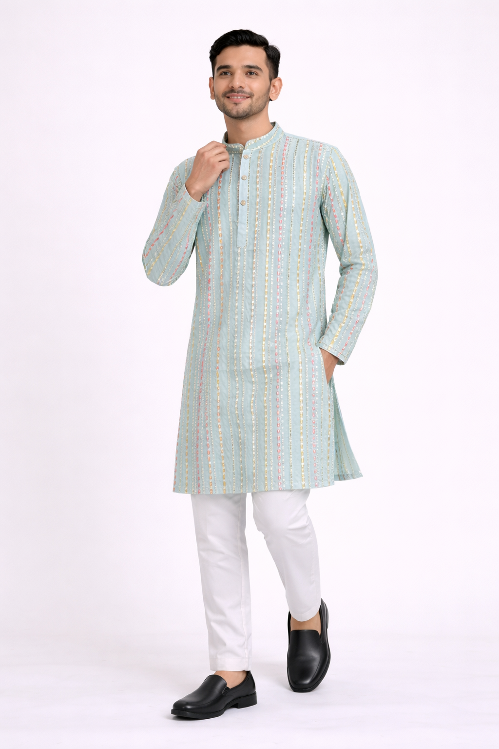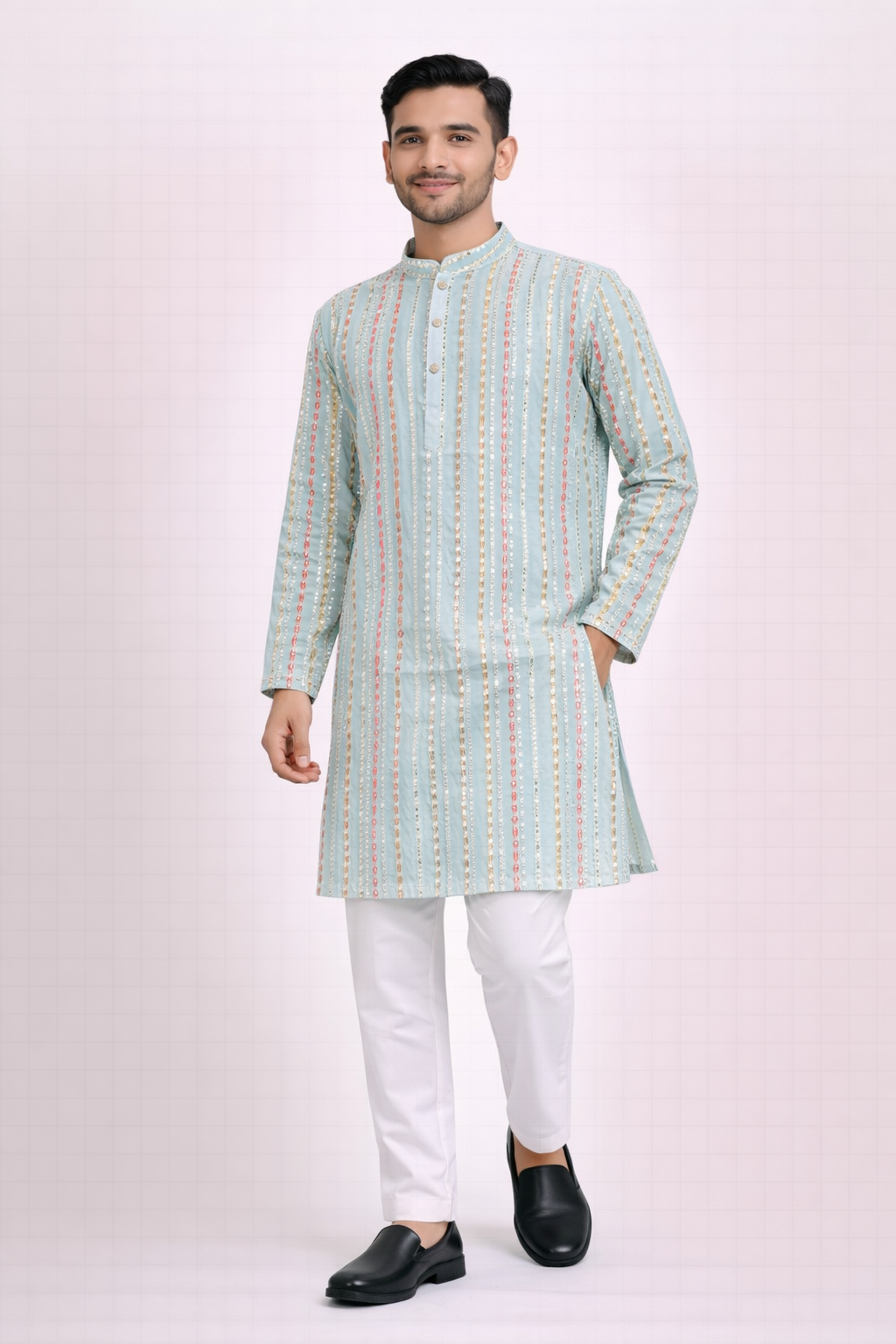 Elevate your festive style with this elegant light kurta set, designed for a refined and modern ethnic look. Crafted in a soft pastel tone, the kurta features vertical embellished detailing with subtle sequin accents in gold and soft hues, adding a graceful shimmer without being overpowering.The classic mandarin collar and buttoned placket enhance its traditional appeal, while the straight-cut silhouette ensures a comfortable and flattering fit. Paired with crisp white pants and formal shoes, this kurta set is perfect for weddings, festive occasions, poojas, and cultural celebrations.