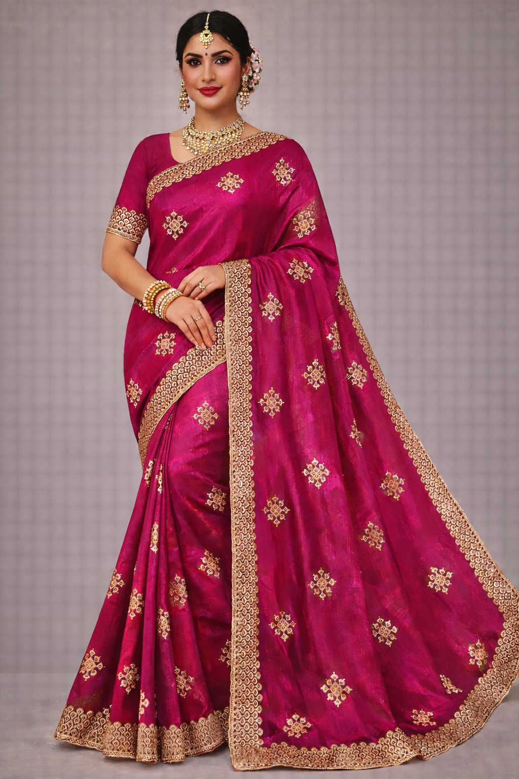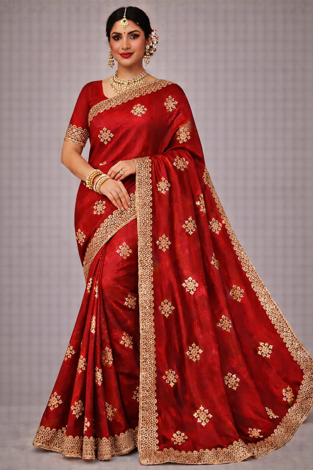 Step into timeless sophistication with this luxurious wine-colored tissue saree designed for grand celebrations. The rich, glossy finish of the fabric enhances its royal appeal, while delicate gold woven motifs are beautifully scattered across the body, adding subtle shimmer and charm.The saree is finished with an intricately embroidered gold border featuring detailed scalloped patterns that elevate its festive richness. The structured border gives the drape a regal frame, making it perfect for statement styling.Paired with a matching wine blouse and styled with a traditional necklace set and stacked bangles, this saree creates a complete occasion-ready look.The elegant color combined with gold detailing makes it ideal for weddings, receptions, festive functions, and evening events.