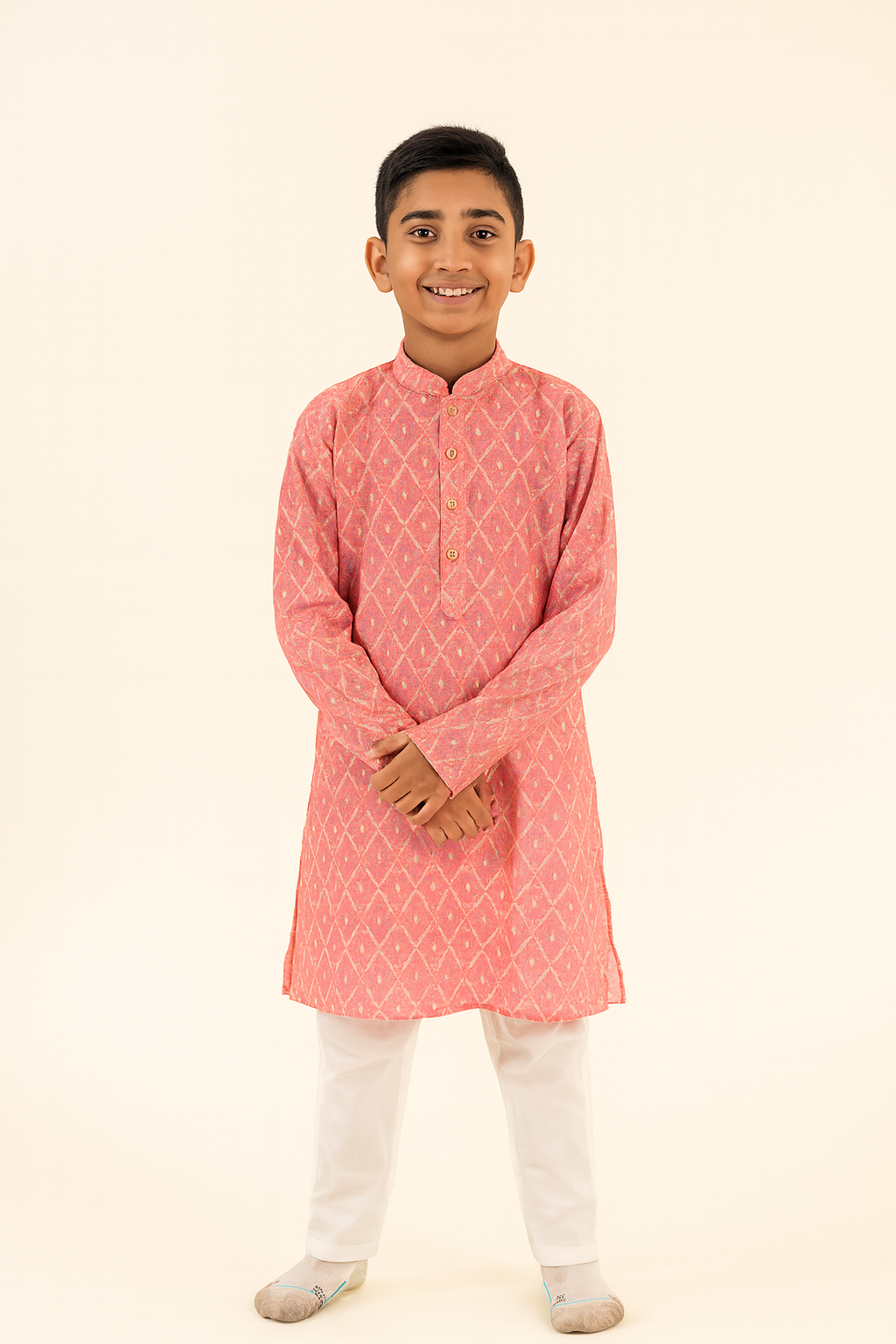 The kurta, worn underneath the Sherwani jacket, is typically made of high-quality fabric and features a comfortable and relaxed fit. It may have subtle embroidery or embellishments that complement the overall design of the suit.