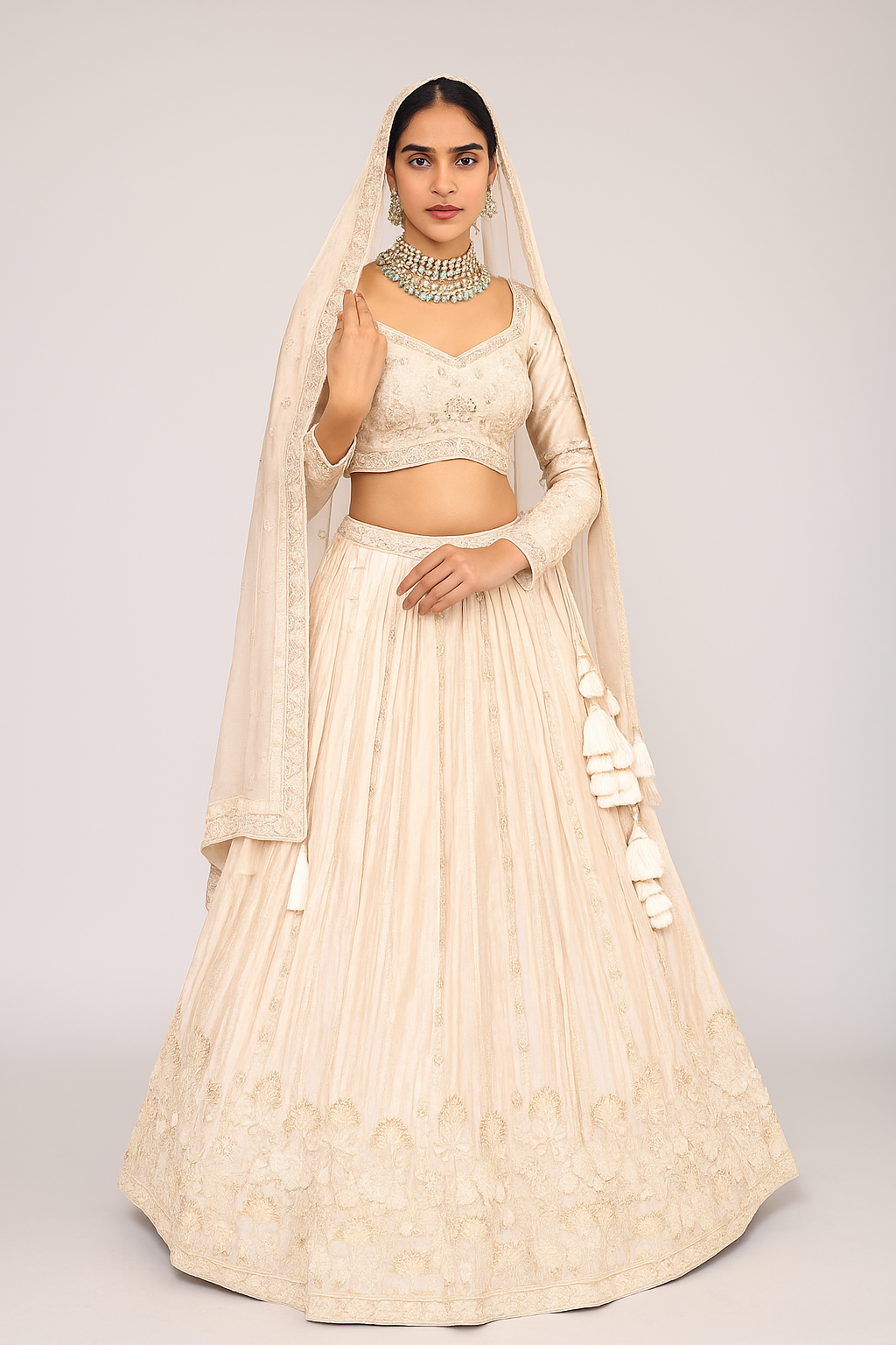 Crafted from premium net and satin fabric with fine lining, the lehenga offers a perfect drape and comfort for extended wear. The neutral tone makes it ideal for day or evening bridal functions, engagement ceremonies, or receptions.