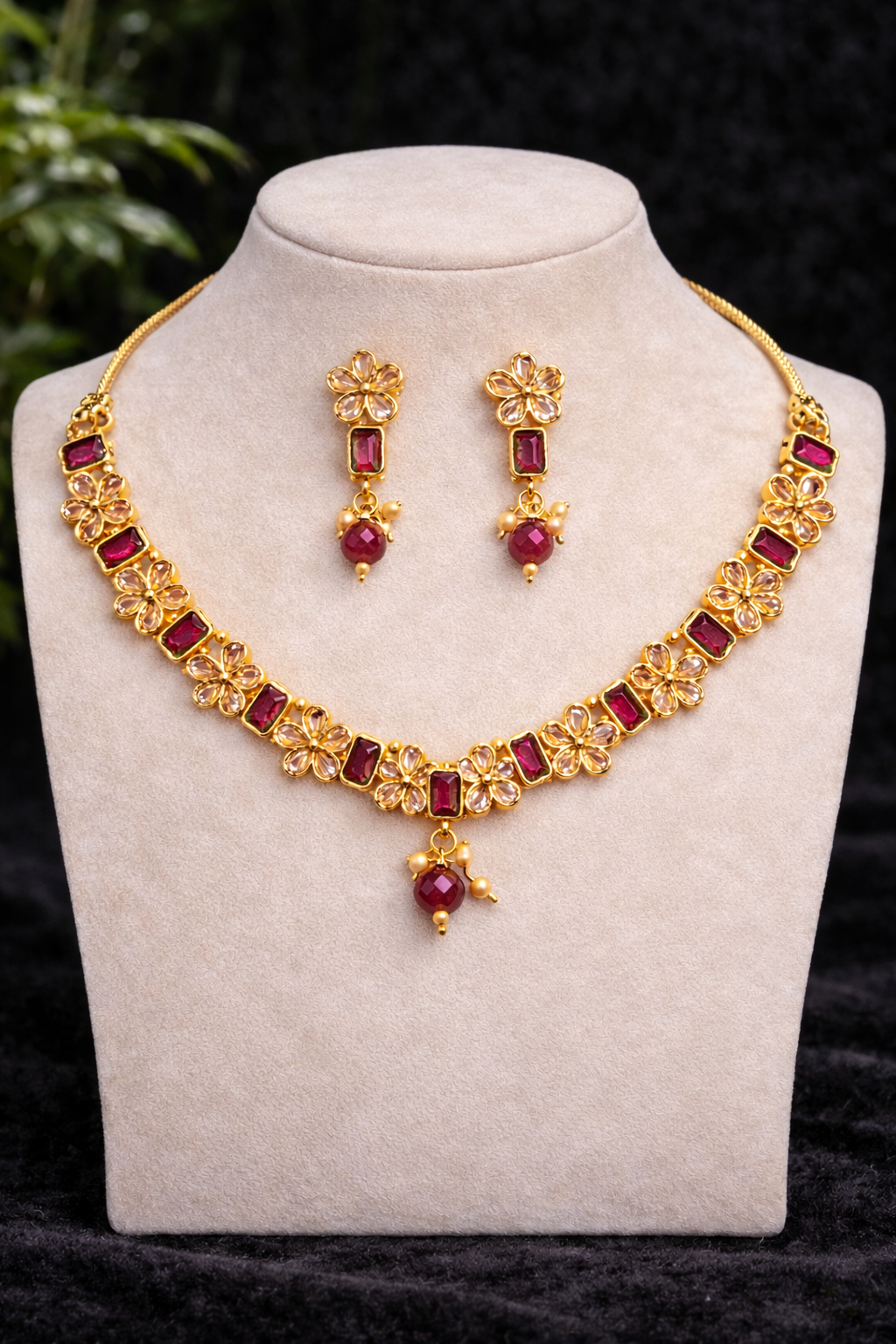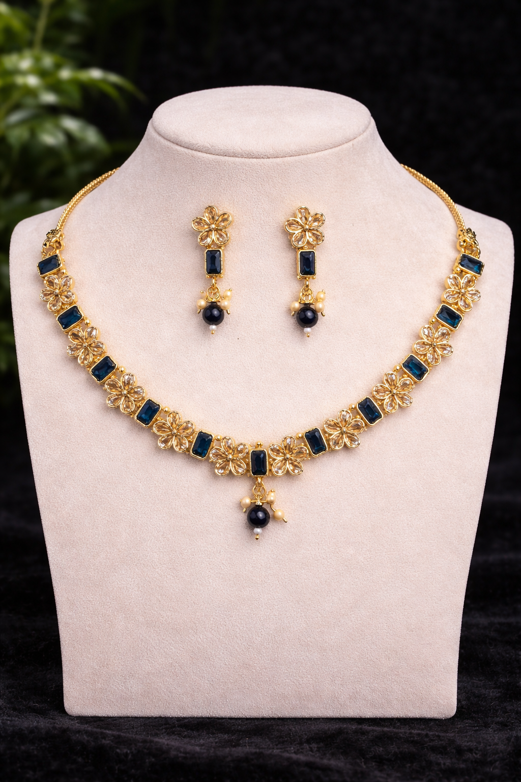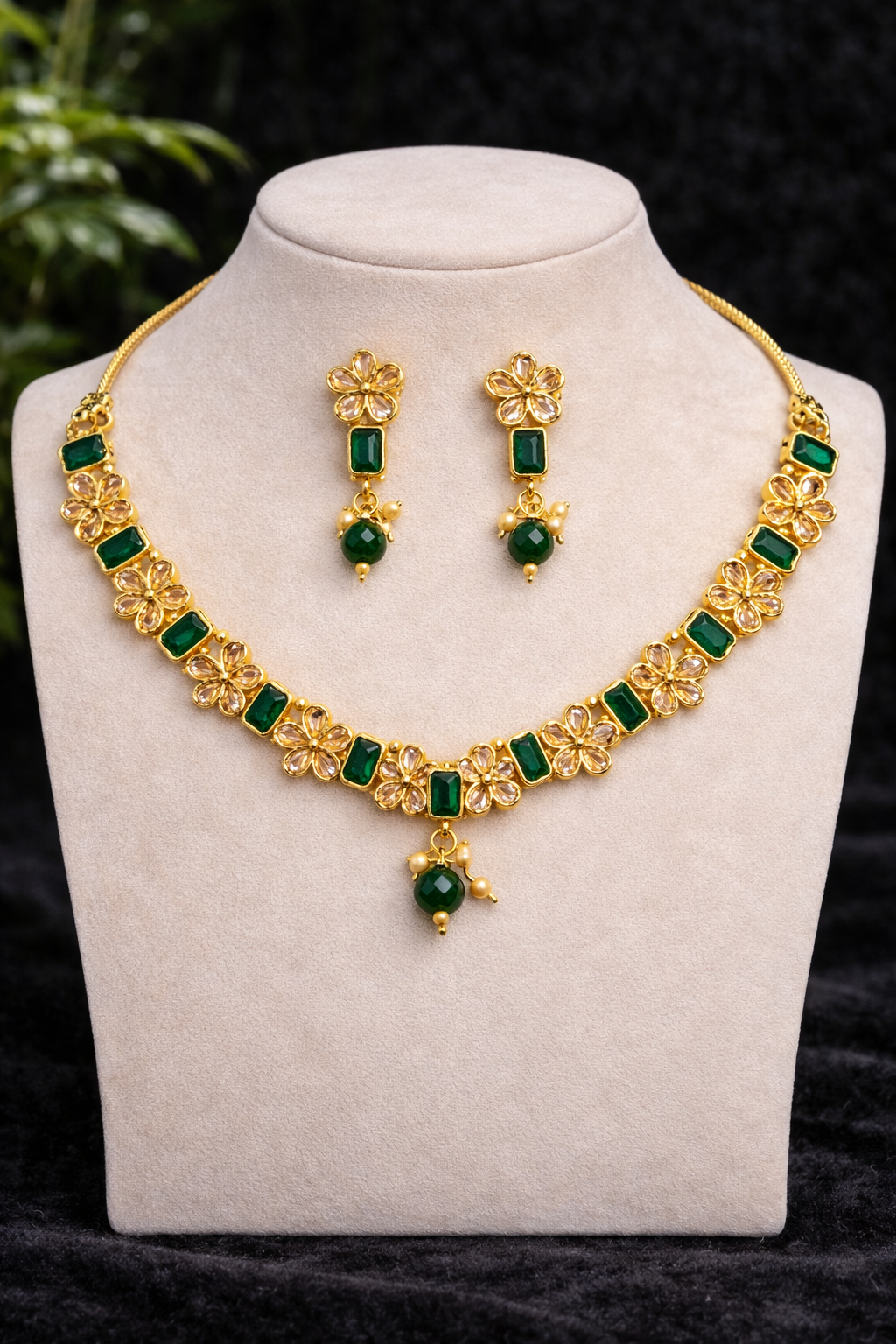 Add timeless elegance to your jewellery collection with this beautifully crafted floral necklace set. Designed with a graceful sequence of gold-tone floral motifs and rectangular stone accents, this set exudes a refined traditional charm. The centre pendant and matching earrings are finished with delicate bead drops that enhance movement and sparkle with every wear.Perfectly balanced between tradition and modern elegance, this necklace set is ideal for weddings, festive occasions, parties, and special celebrations. Pair it effortlessly with sarees, lehengas, or ethnic suits for a complete, sophisticated look.