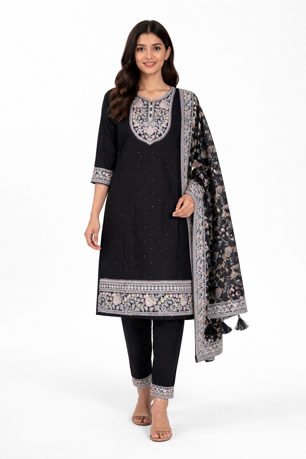 Step into timeless elegance with this beautifully crafted black kurta set, designed for effortless grace and sophistication.