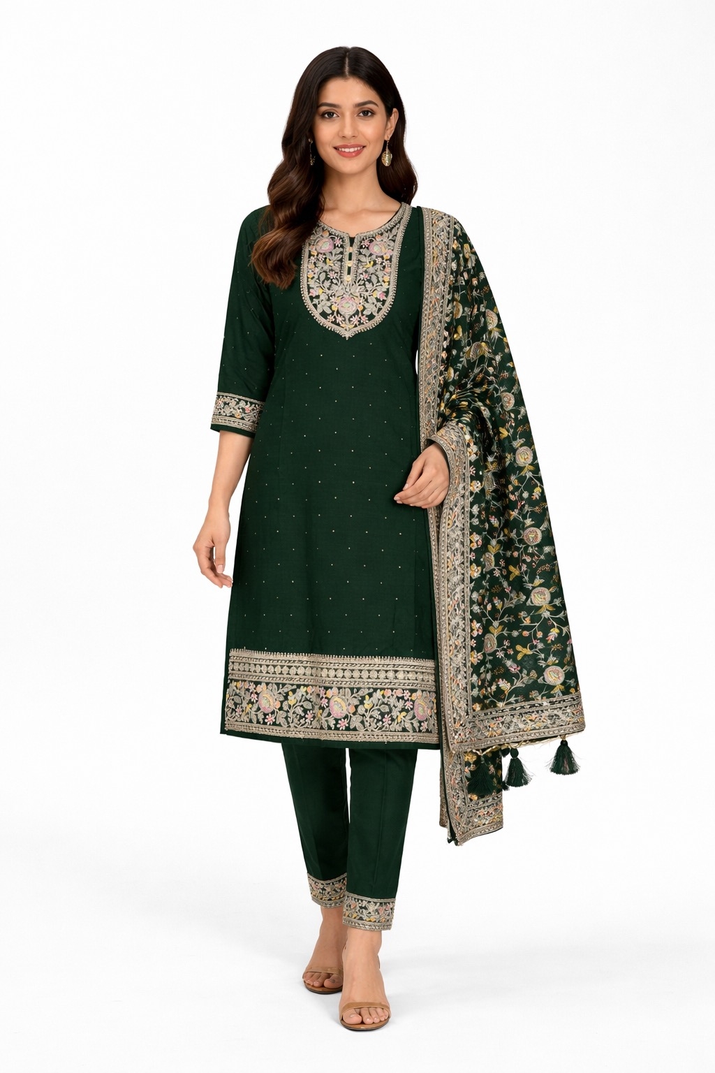 Paired with sleek straight pants finished with matching embroidered borders, this set offers a balanced blend of comfort and style.