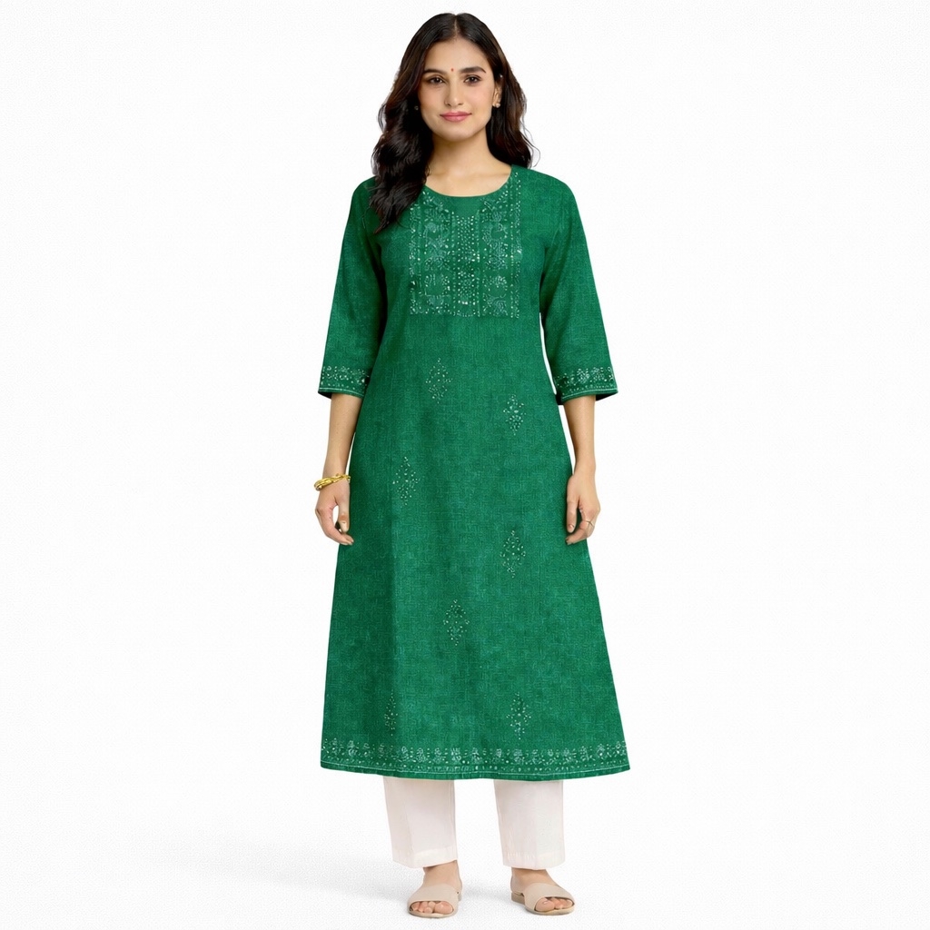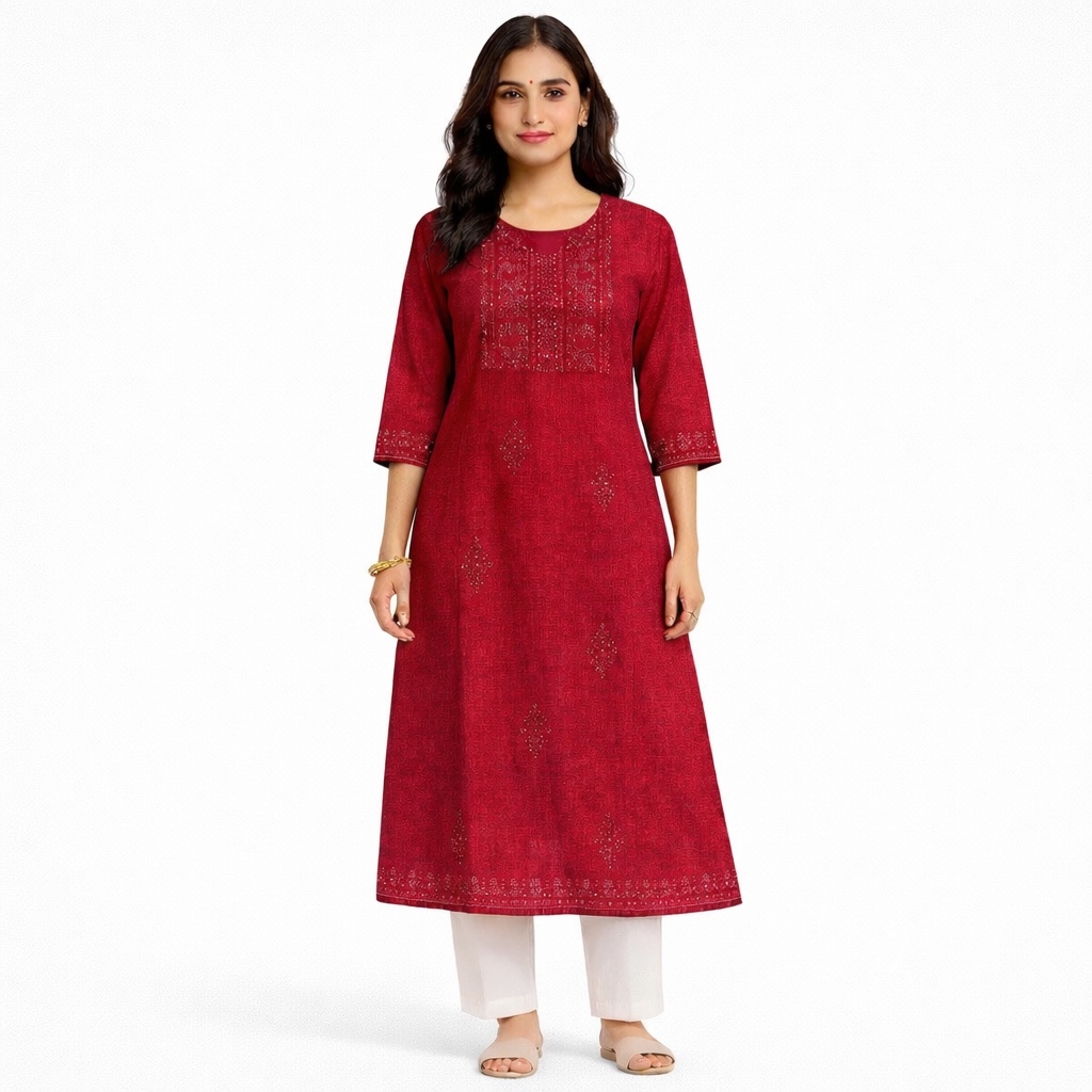 The round neckline and three-quarter sleeves with delicate detailing add a touch of sophistication, making it perfect for both casual elegance and festive occasions.