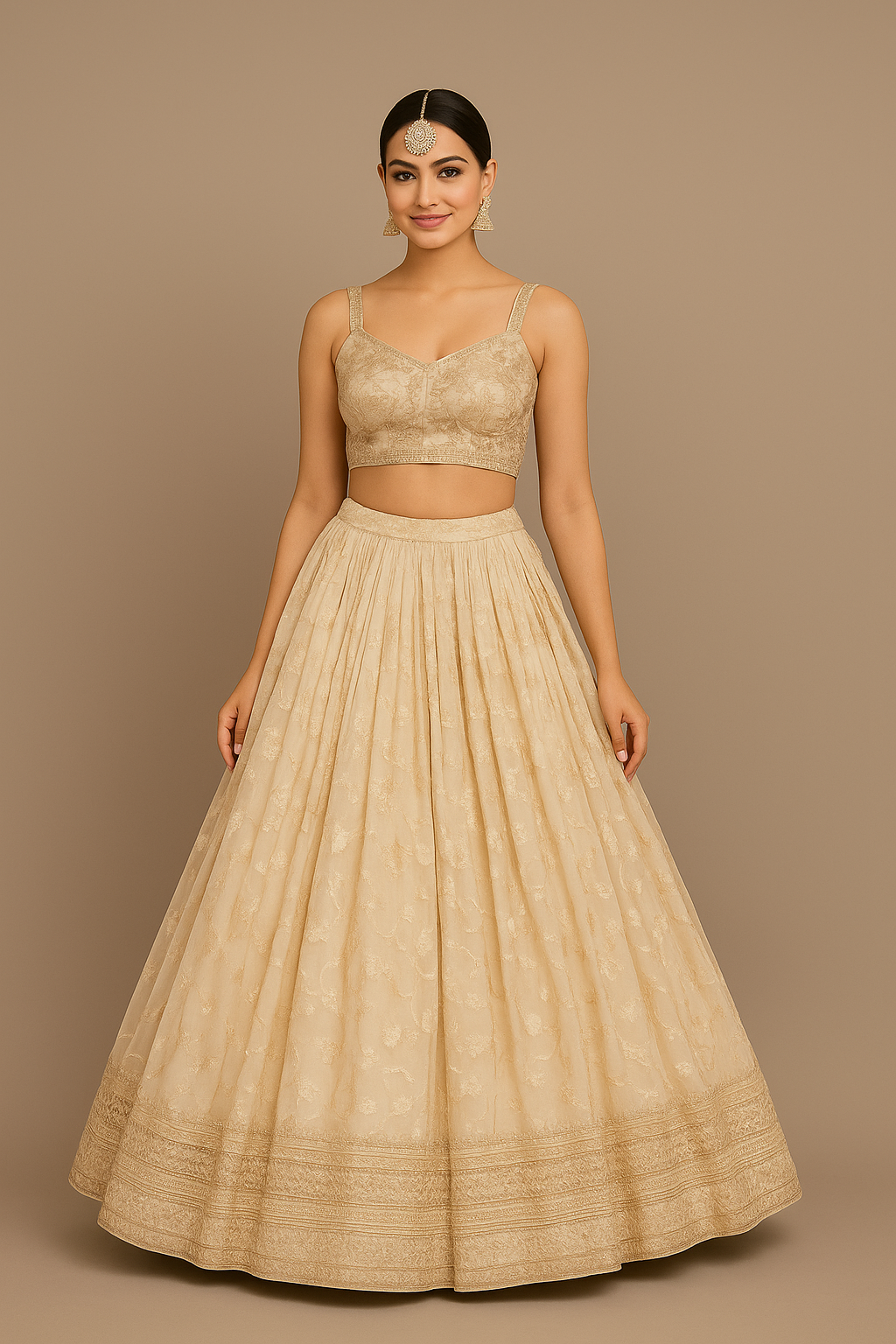 The fitted embroidered blouse with slender straps offers a modern touch, while the soft golden hue enhances its understated royal charm. Perfect for brides who adore subtle glamour, this outfit embodies finesse and tradition with every detail.