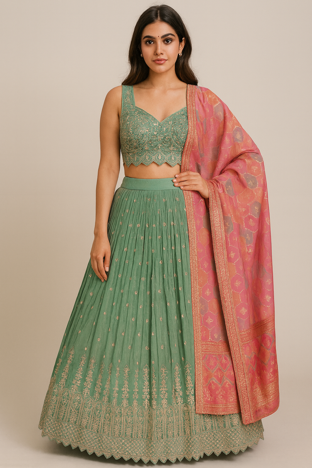 Make a graceful statement with this exquisite sea-green lehenga set, beautifully crafted with fine embroidery and premium detailing. The blouse features intricate mirror work, thread embroidery, and a scalloped hem for a designer touch. The lehenga is adorned with scattered buti embroidery and a richly embellished border, giving it an elegant flow and a luxurious finish. Paired with a contrasting pink Banarasi-style dupatta featuring gold zari motifs, this ensemble perfectly blends tradition with modern sophistication.