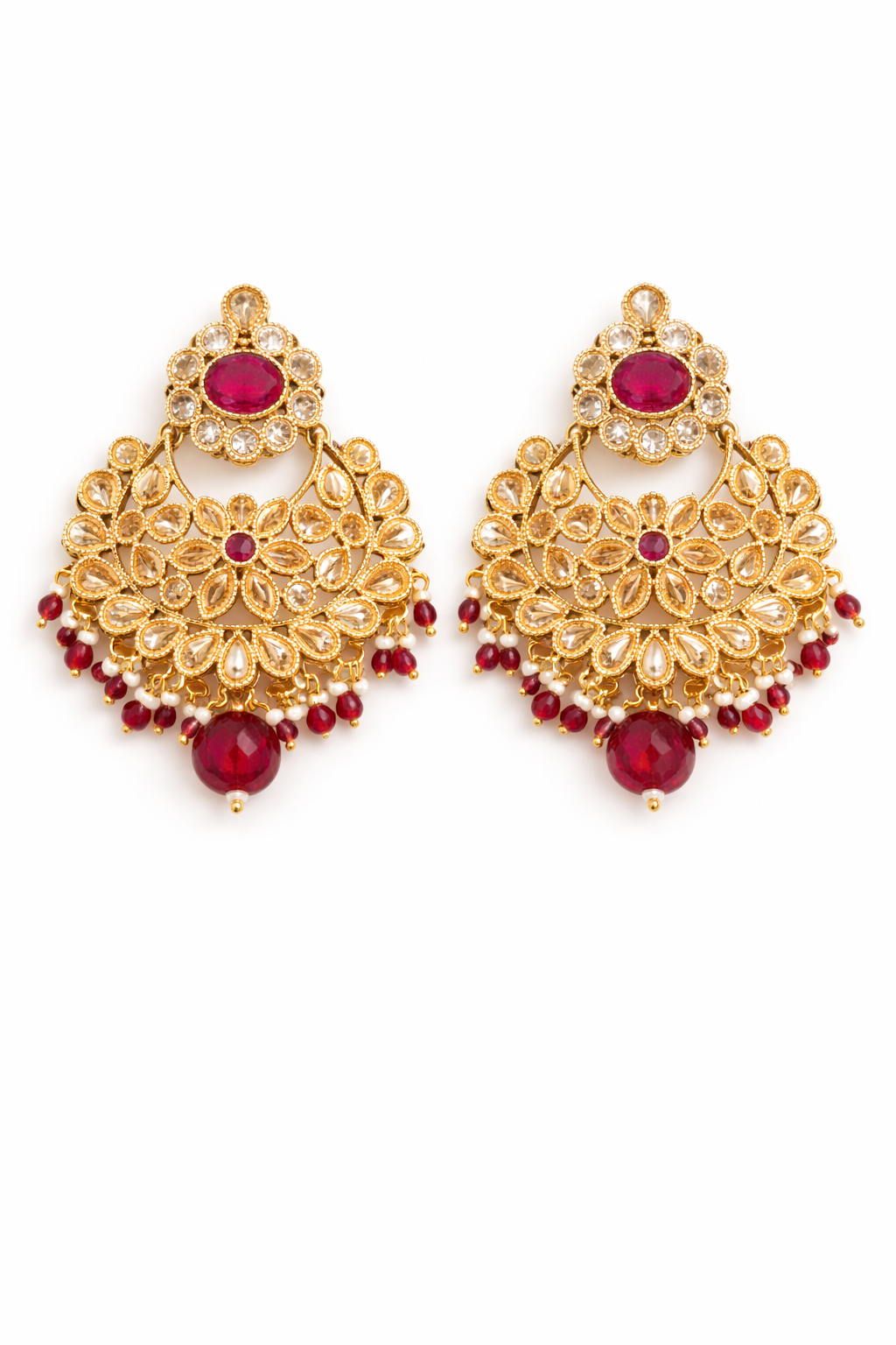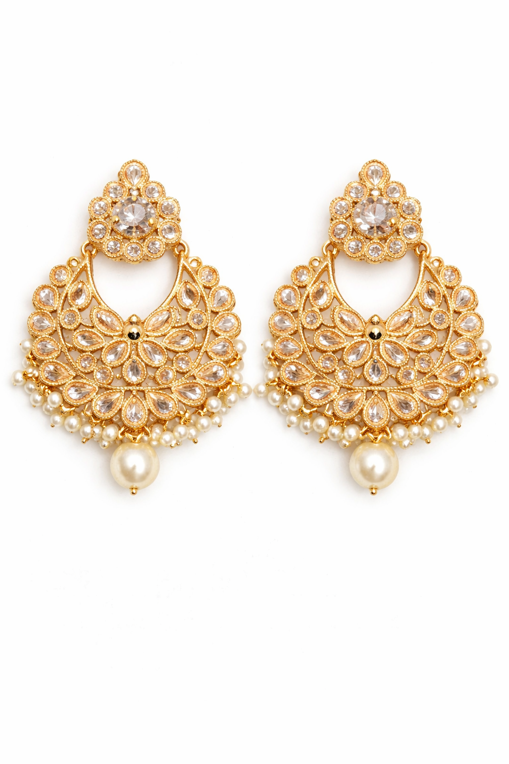 Elevate your festive look with these elegant gold-tone chandelier earrings, beautifully crafted with intricate floral filigree. Adorned with sparkling champagne-hued stones and finished with delicate pearl drops, this timeless design exudes classic grace and sophistication. Perfect for weddings, traditional celebrations, and special occasions, these earrings add a refined touch to both ethnic and fusion outfits.