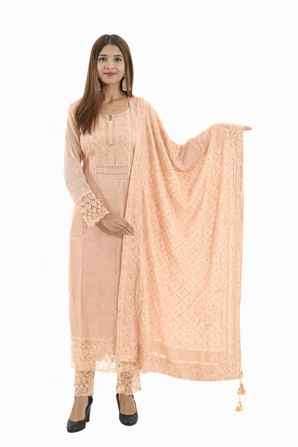 Includes a straight kamiz, a matching dupatta, and pants.Features attached sleeves for a complete and polished look.