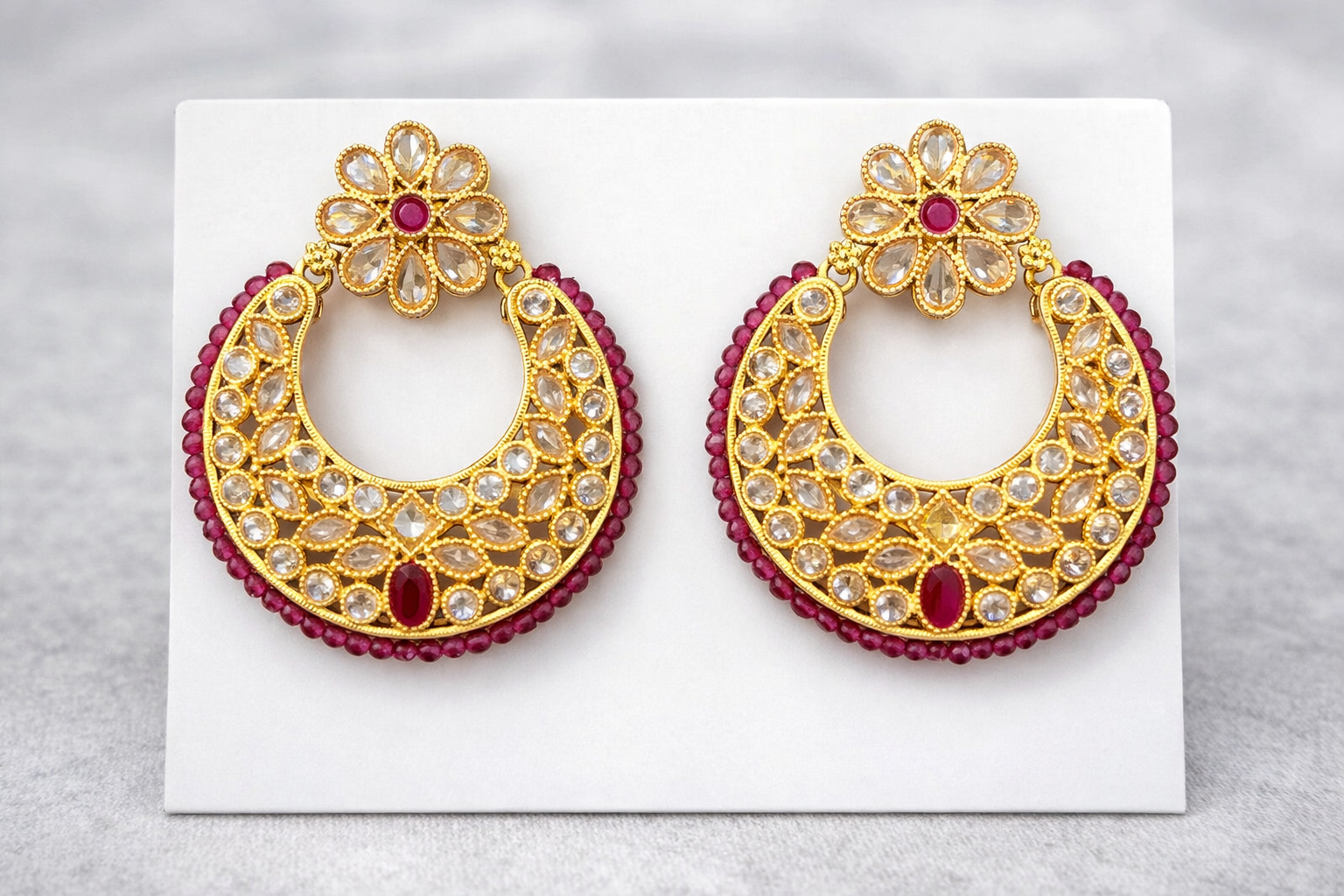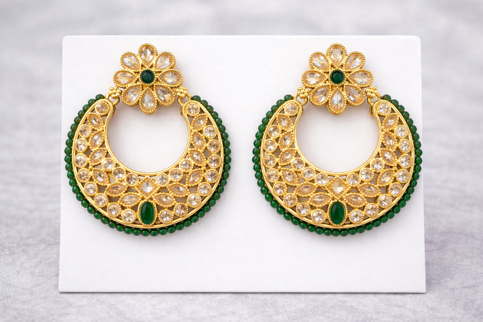 Elegant gold-tone crescent earrings crafted with intricate kundan-style detailing. Featuring clear teardrop stones, a rich green centerpiece, and a delicate green bead border, these earrings offer a perfect blend of tradition and sophistication. deal for weddings, festive occasions, and evening wear, they pair beautifully with lehengas, sarees, and anarkalis.