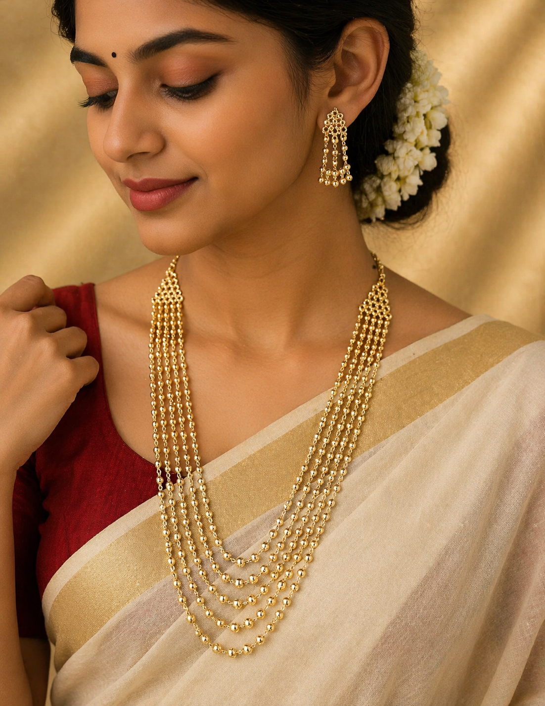 Multi-Layer Gold Mala SetA statement of elegance and grandeur, this stunning multi-layer mala set is designed to elevate your traditional look. Featuring multiple cascading strands of finely crafted gold beads, this piece creates a rich, layered silhouette that exudes luxury and sophistication.