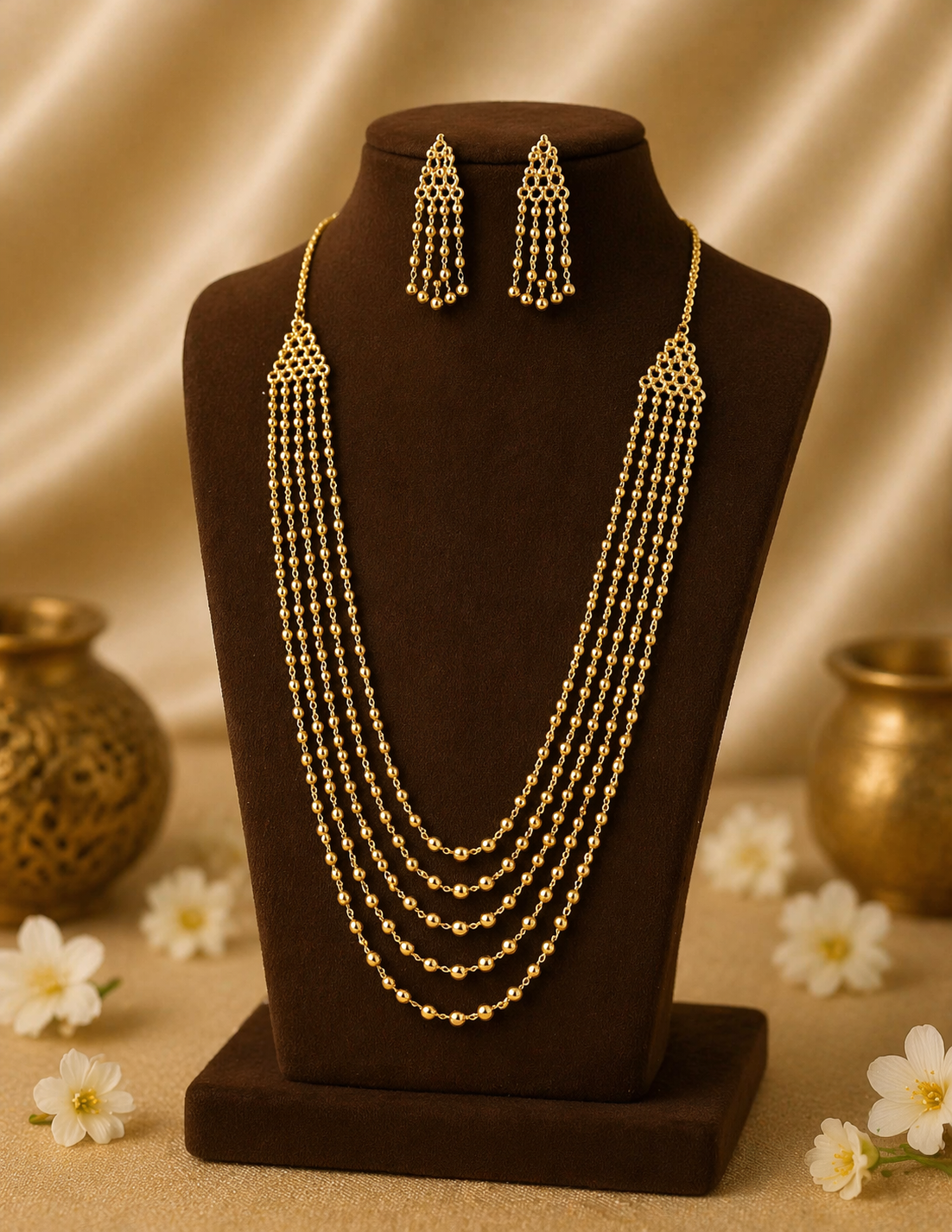 Product Details:• Includes: Multi-layer mala chain + matching long earrings• Design: Cascading bead strands with structured top detailing• Style: Traditional / Bridal / Festive wear• Finish: Antique gold polish• Closure: Adjustable hook