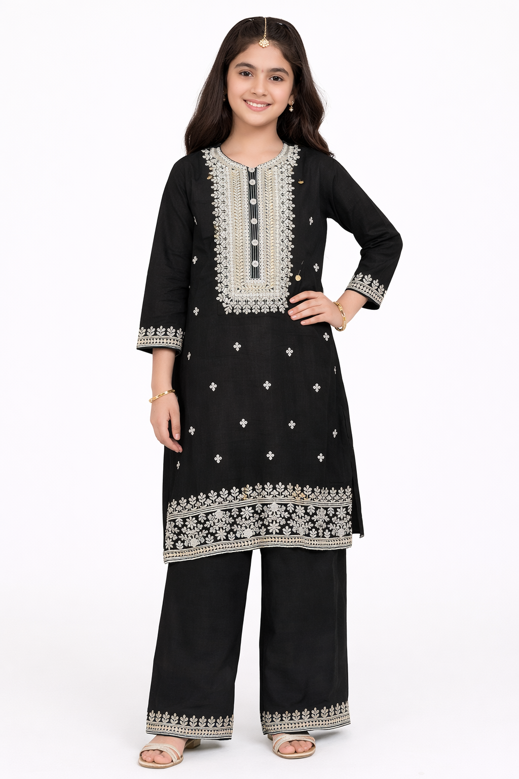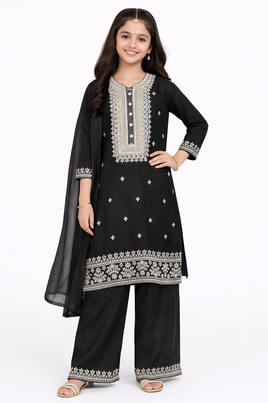 This elegant girls palazzo set is crafted to give a refined and graceful traditional look, perfect for festive and special occasions. The outfit features a beautifully tailored kurti in a rich purple shade, highlighted with intricate white embroidery on the neckline, sleeves, and hem. Delicate embroidered motifs are evenly placed across the kurti, adding a touch of sophistication.The kurti is paired with comfortable, wide-leg palazzo pants that offer ease of movement while maintaining a stylish silhouette. A matching lightweight dupatta completes the ensemble, enhancing its overall charm. Styled on a 12-year-old girl model against a clean white background, this outfit is ideal for website presentation and online listings