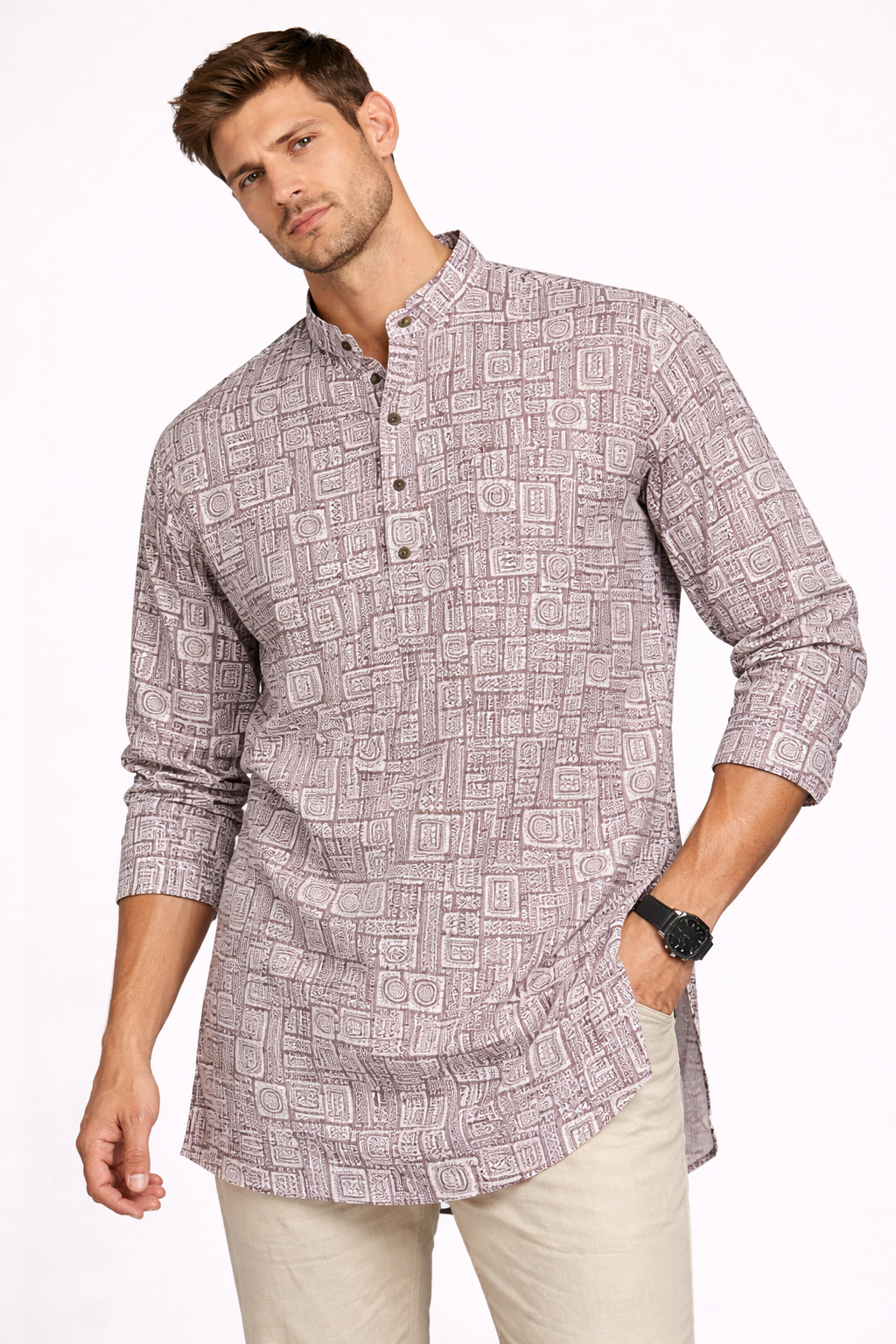 Refresh your ethnic wardrobe with this stylish men’s printed kurta, designed for effortless everyday elegance. Featuring an all-over geometric and traditional motif print, this kurta blends contemporary patterns with classic ethnic appeal.Crafted in a comfortable, breathable fabric, it offers a relaxed yet structured fit, making it ideal for festive gatherings, casual outings, and cultural occasions. The band collar with buttoned placket adds a modern touch, while the detailed print ensures a refined, eye-catching look.