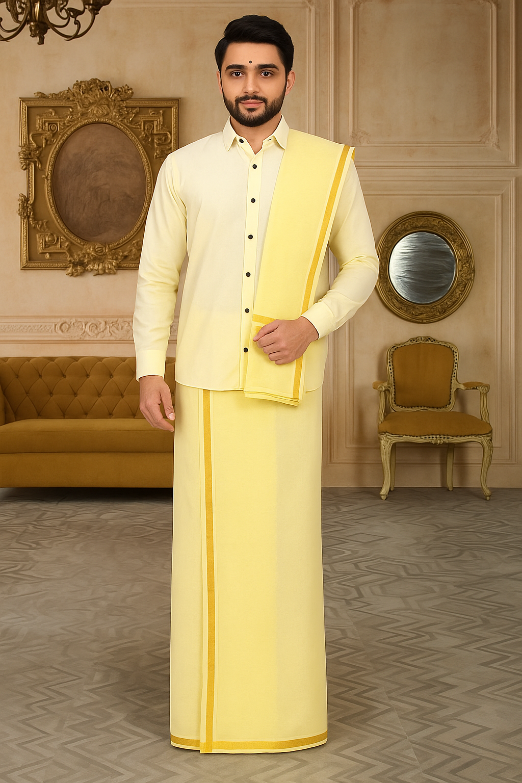 Embrace grace and simplicity with this Men’s Traditional Dhoti Set, a perfect fusion of cultural charm and modern elegance. This ensemble features a light dhoti with a delicate golden border, paired with a matching dupatta for a refined and festive appeal. LighDhoti & Dupatta with Gold Borde Off-white full-sleeve cotton blendSoft, breathable material ideal for tropical climates Dhoti, & Dupatta Perfect for weddings, temple ceremonies, festive pujas, and cultural events Traditional comfortable drape with a polished silhouettePair with traditional sandals or mojris and accessorize with a simple gold chain or watch for a complete, elegant ethnic look.