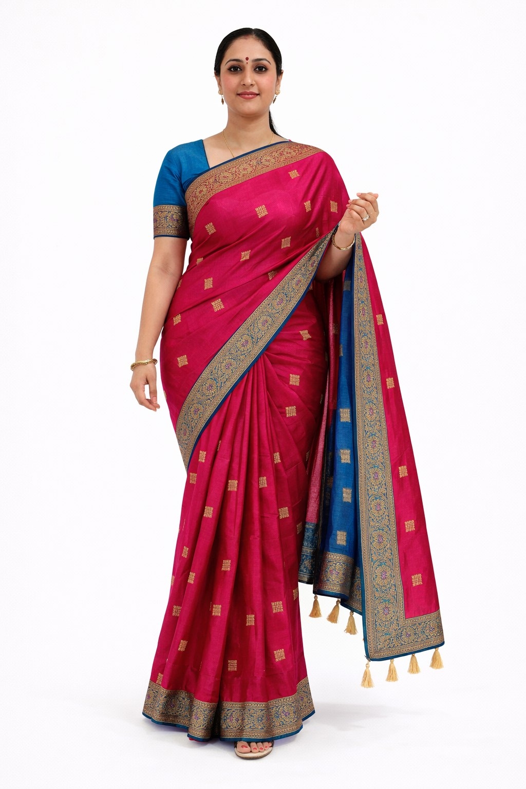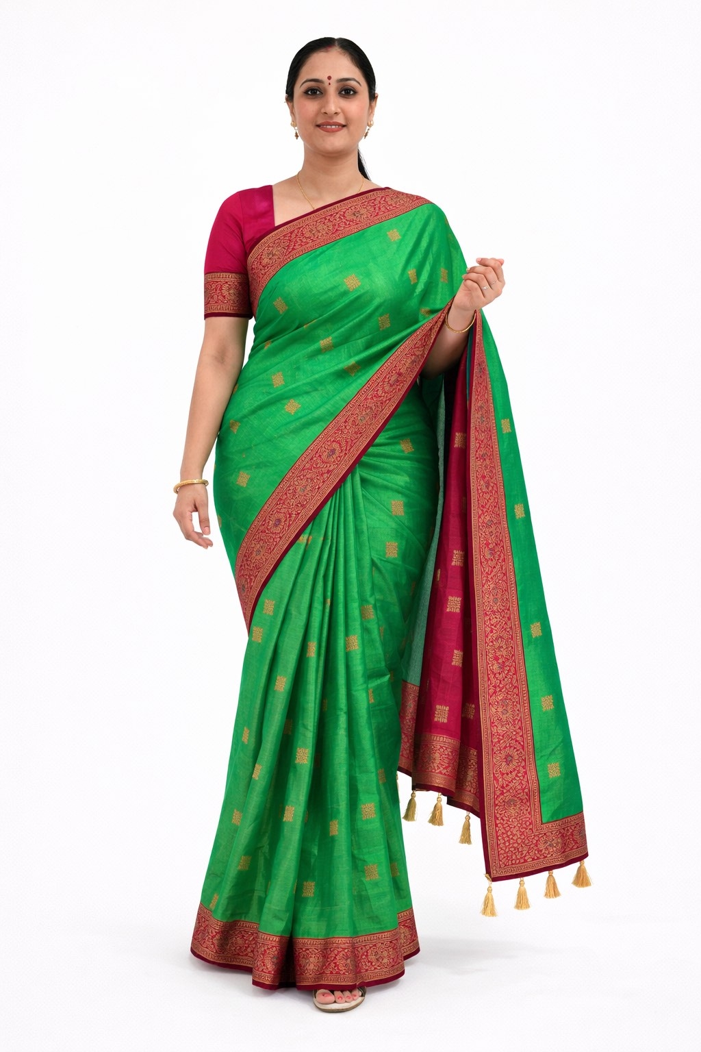 The pallu drapes gracefully with coordinated border detailing and tassel accents, adding movement and festive sophistication to the overall look.