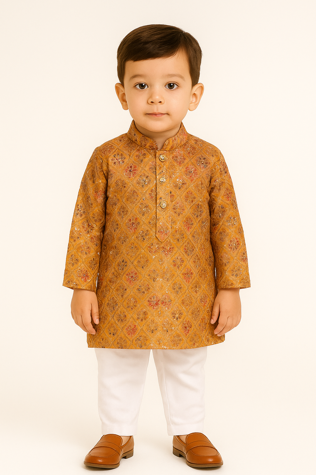A beautifully crafted traditional boys sherwani set designed for festive occasions, weddings, and cultural celebrations. This mustard sherwani features an elegant all-over printed pattern with subtle sequin-style shine that adds a refined festive touch. The neckline is finished with three designer buttons, giving the outfit a stylish and classic look.