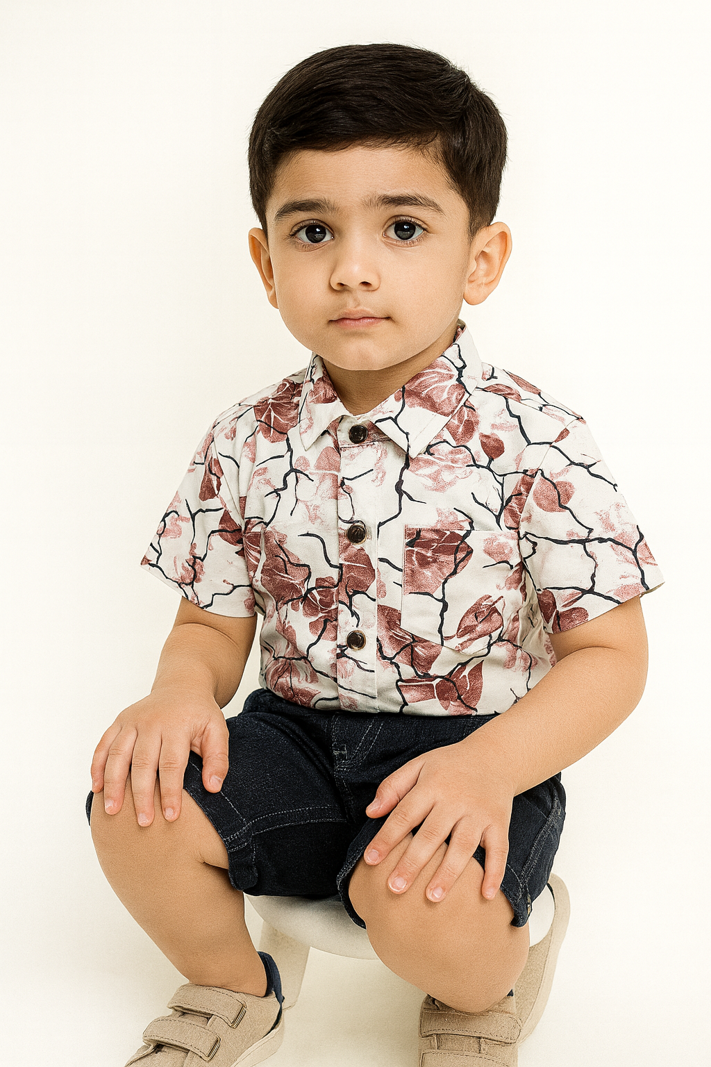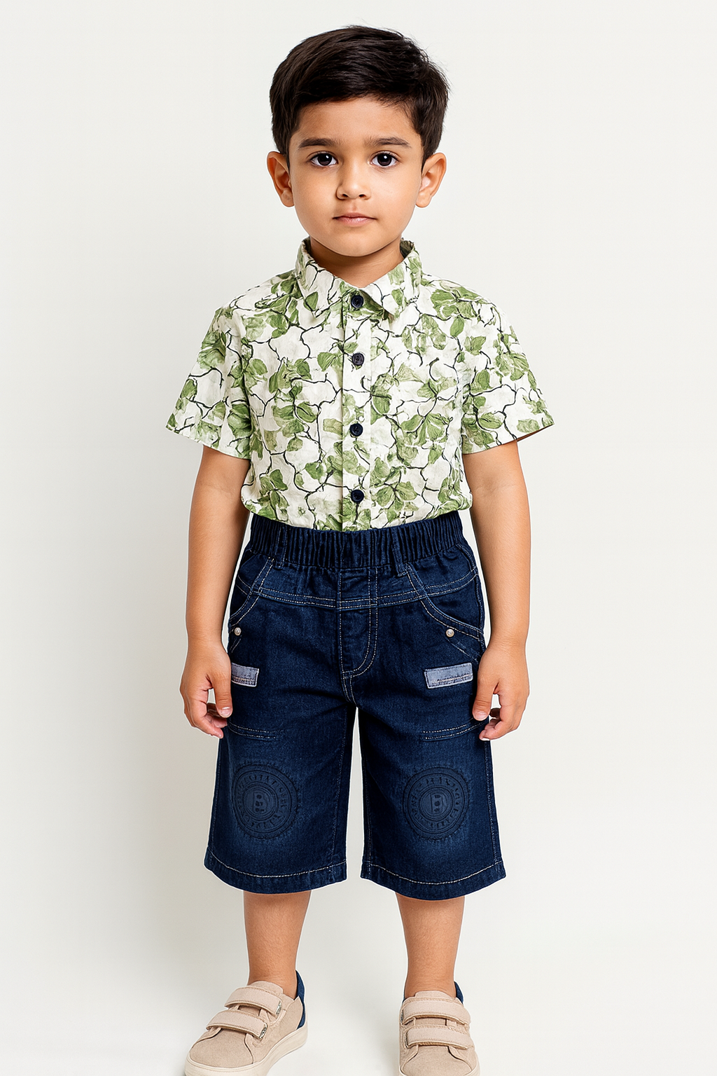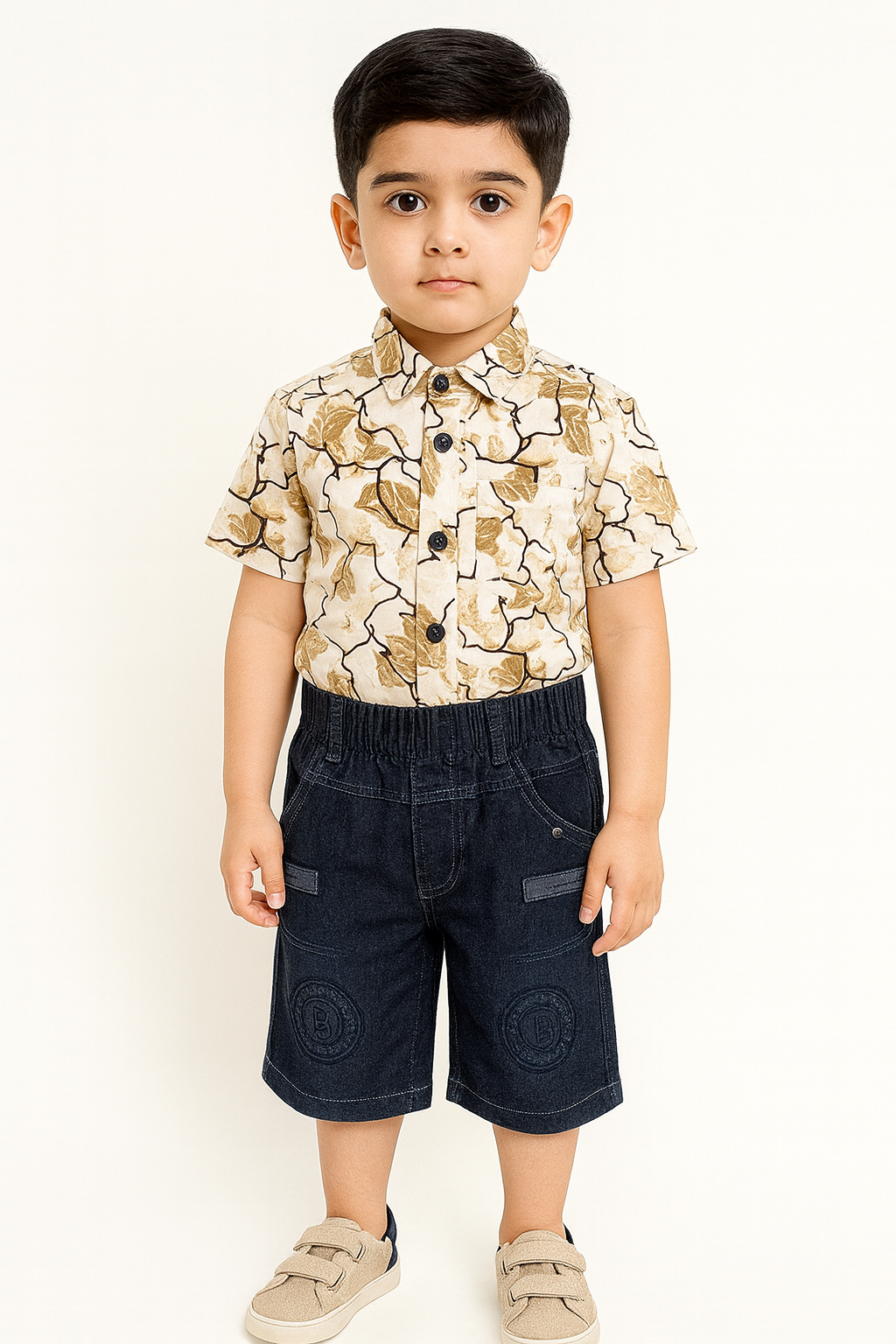 Smart and comfortable boys’ outfit featuring a soft printed collared shirt paired with blue denim — available in both long pants and shorts. Perfect for daily wear, outings and family events.