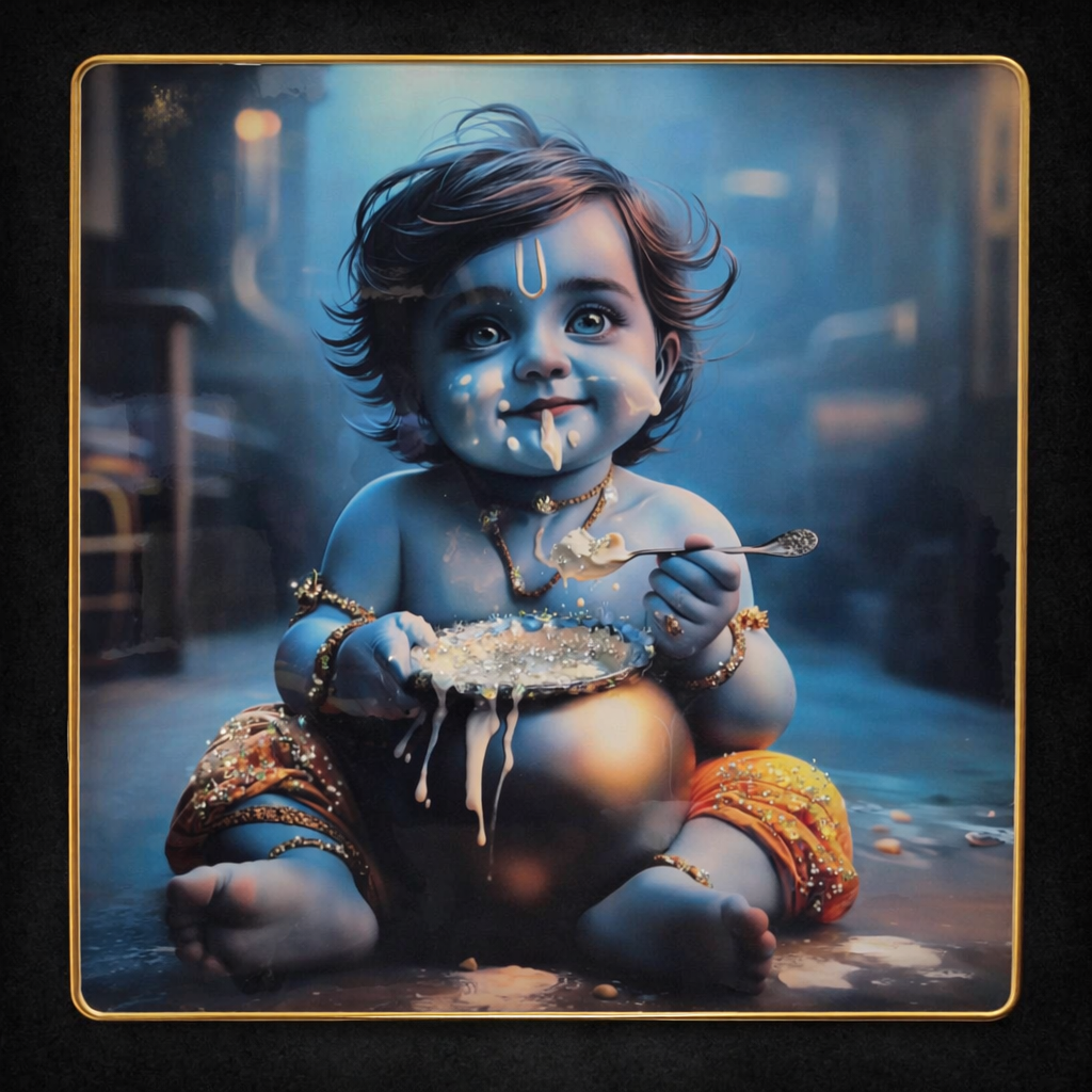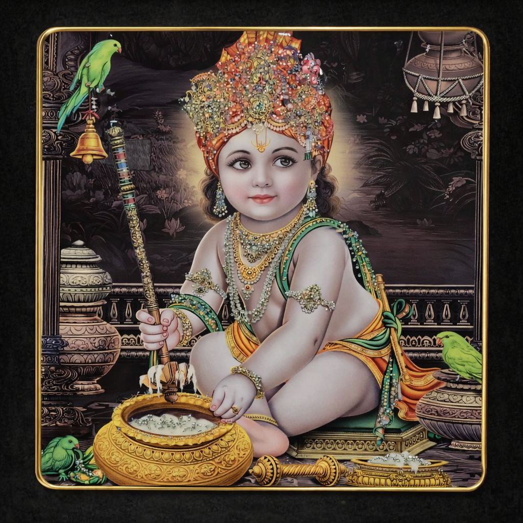 Celebrate divine innocence and traditional beauty with this elegant 16×16 Bal Krishna Decorative Frame. Featuring a charming depiction of Little Krishna (Makhan Chor) with rich artistic detailing, this premium square frame brings warmth, devotion, and timeless cultural charm to your décor.The artwork beautifully captures Bal Krishna in a playful and graceful form, surrounded by intricate ornaments, soft traditional elements, and a decorative spiritual setting. With its rich color palette, fine embellishment look, and premium finish, this frame is perfect for enhancing your home temple, living room, office, or gifting collection.A beautiful décor piece that blends spirituality with artistic elegance.