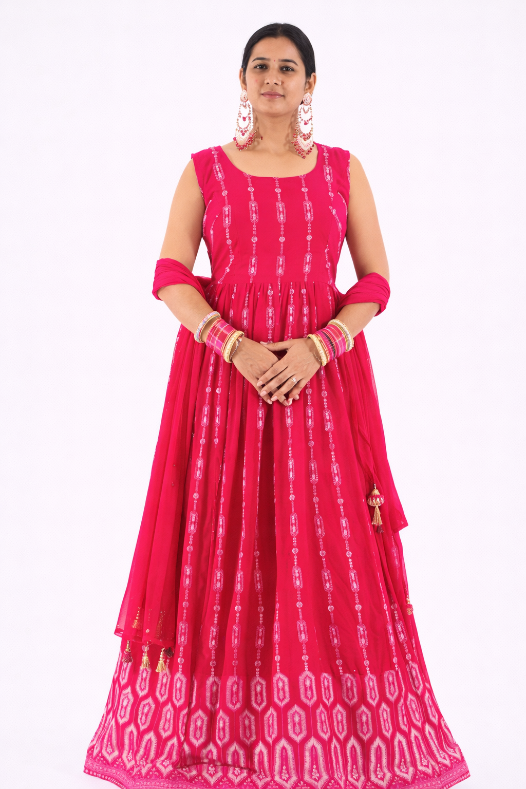 Make a graceful festive statement with this rani pink Anarkali gown, designed for comfort, elegance, and everyday celebrations. Crafted in a soft, flowy fabric, the gown features vertical Ikat-inspired motifs that elongate the silhouette and create a flattering, elegant fall.