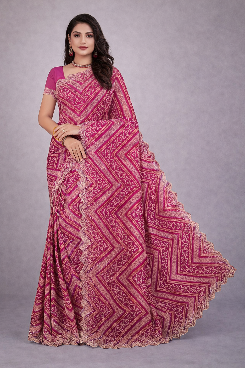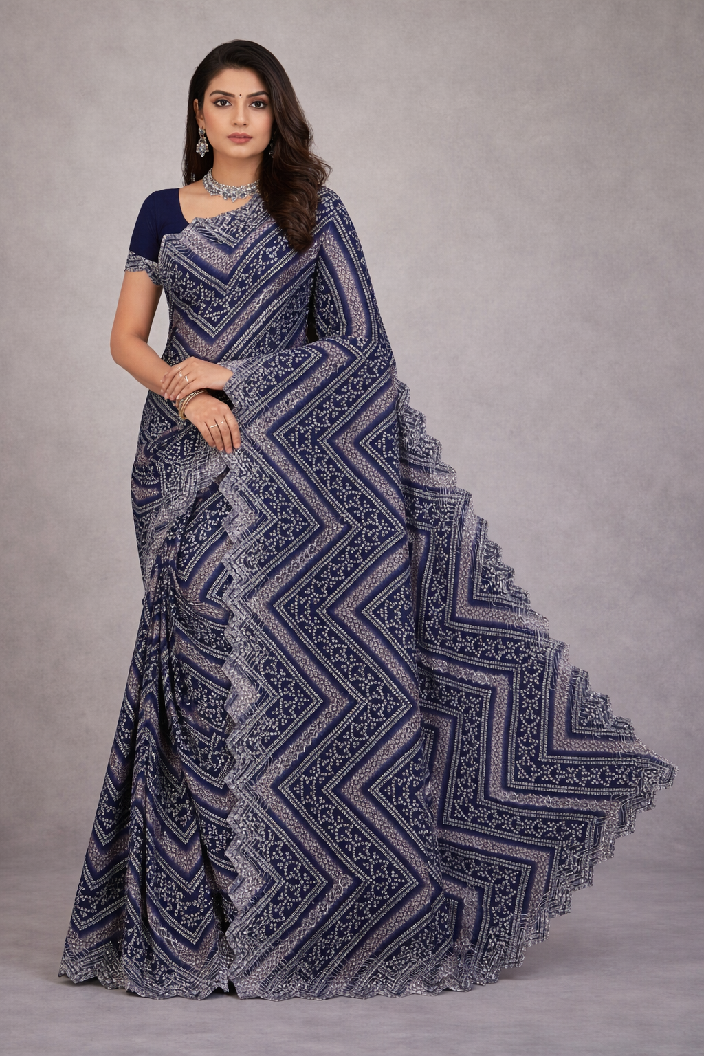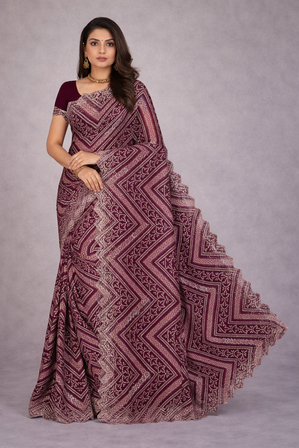 A graceful statement saree designed for women who love timeless elegance with a modern edge. This beautiful saree features a striking zigzag-inspired all-over pattern with delicate traditional detailing, creating a rich and eye-catching drape. The flowy silhouette and detailed border make it perfect for festive wear, family functions, pooja, dinners, and special occasions.Paired with a matching blouse piece, this saree gives a polished and refined look while still feeling easy to wear and style. Whether dressed up with jewelry for an event or styled simply for a sophisticated day look, this design stands out beautifully.