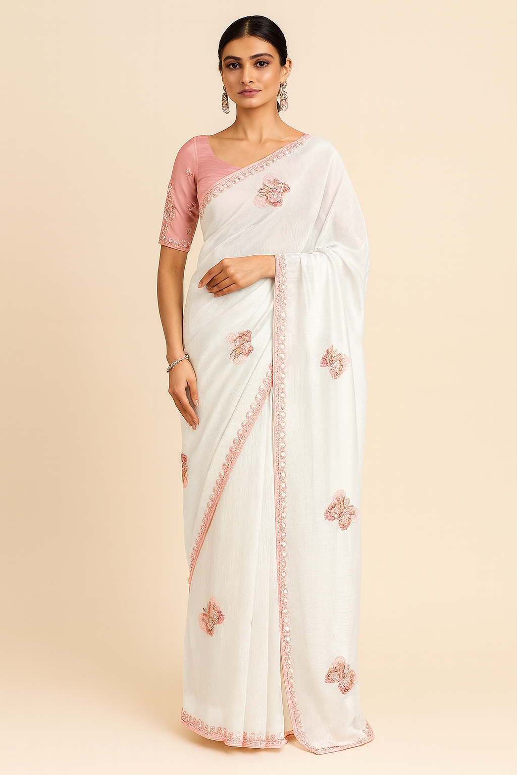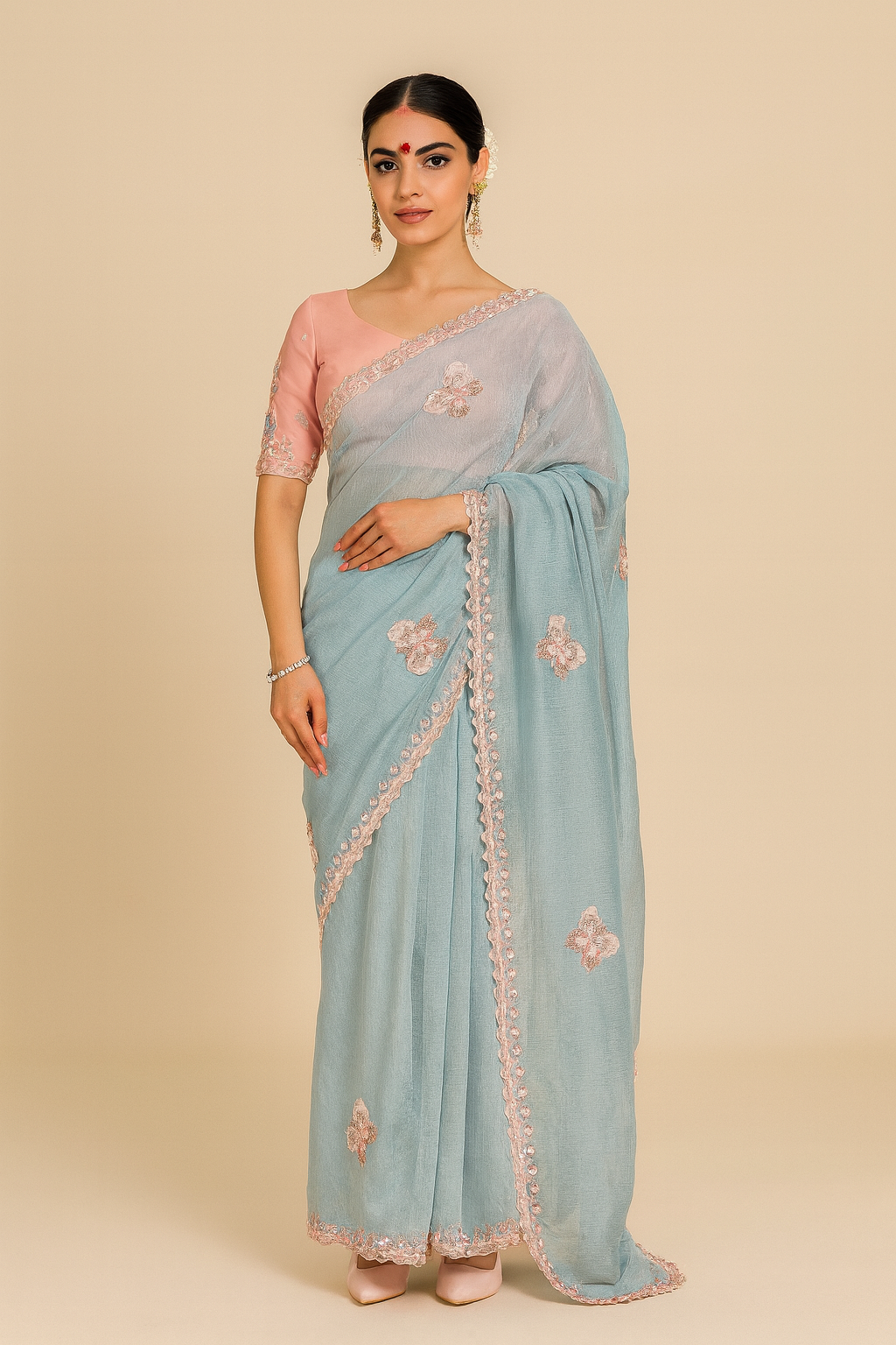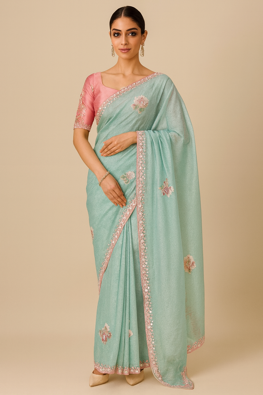 Elegance meets tradition in this stunning Saree. Crafted with delicate fabric, this saree features exquisite floral embroidery enhanced with sequins and pearl-like embellishments, giving it a luxurious and festive touch. The scalloped border adds a graceful contrast, while the matching pastel blouse with intricate embroidery elevates its charm.Perfect for weddings, festive occasions, and special celebrations, this saree is designed to make you look effortlessly stylish and regal.Color: Sea Green with pastel pink blouseFabric: Lightweight, soft-drape fabric (perfect for all-day wear)Design: Hand-embroidered floral motifs with sequins and pearl highlightsBlouse: Contrasting pink blouse with embroidered sleevesOccasion: Wedding, Festive, Partywear, Special Occasions
