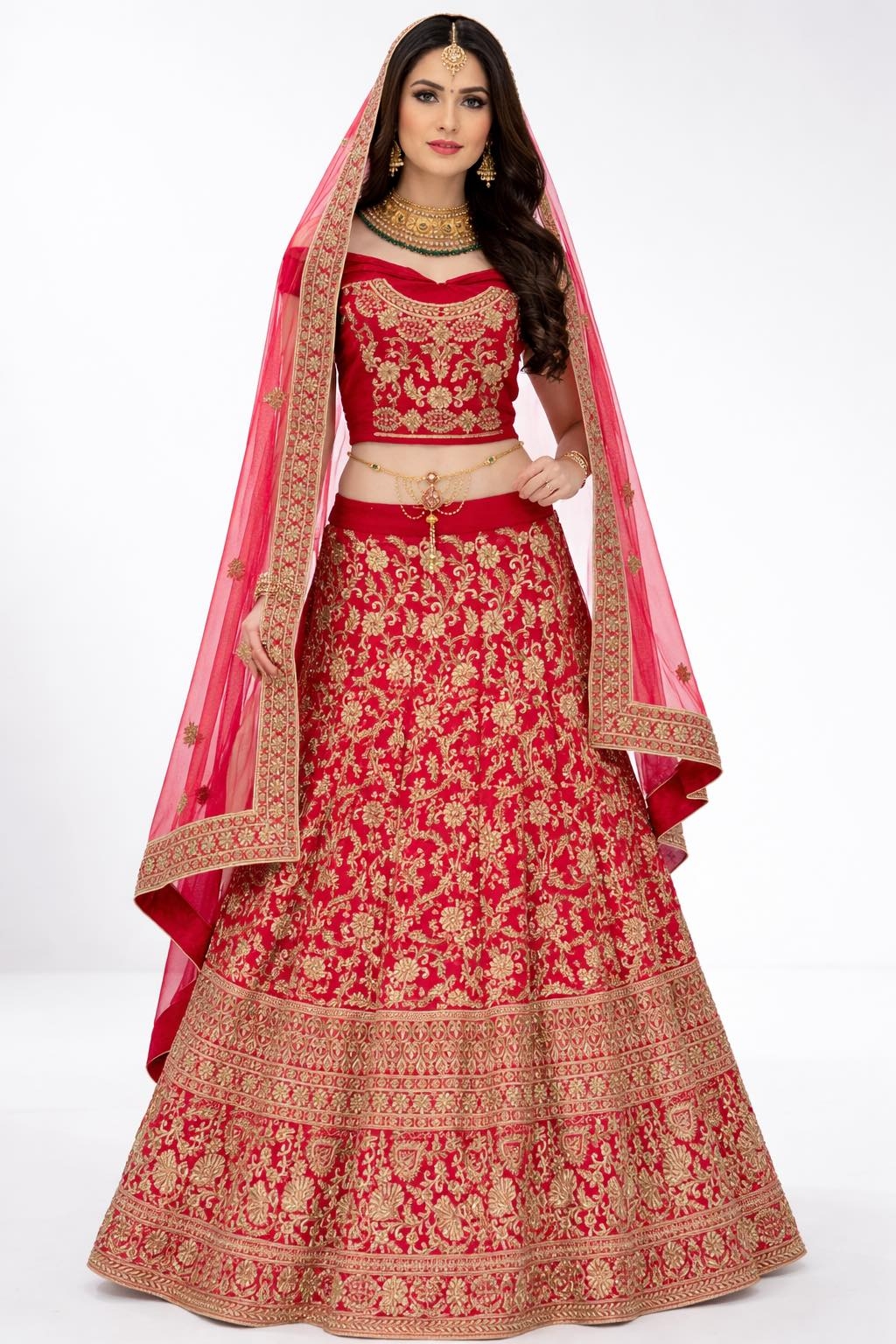 Paired with traditional bridal jewelry, this ensemble radiates royal elegance and timeless charm.