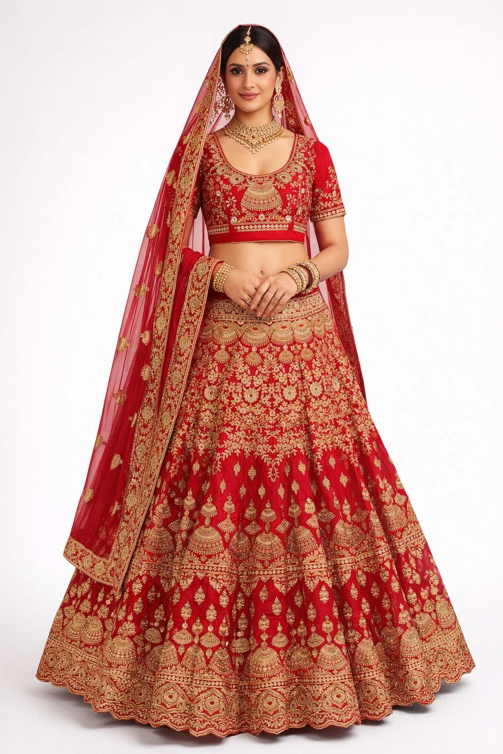 • Premium bridal silk lehenga with heavy zari embroidery
