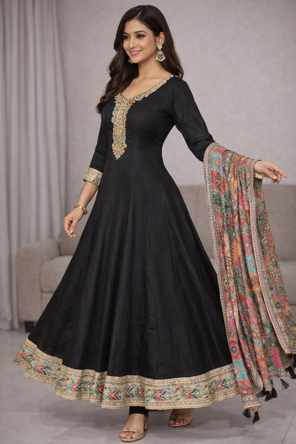 Grace meets tradition in this elegant Black Anarkali Suit, designed for women who love timeless silhouettes with a vibrant twist. The Anarkali kurta features a flattering flared cut with delicate multicolour embroidery on the neckline, adding subtle richness against the classic black base. The three-quarter sleeves are finished with embroidered cuffs, enhancing the overall refined look.Paired with the kurta is a striking multicolour printed dupatta, adorned with intricate patterns and an ornate border that brings life and contrast to the ensemble. The richly detailed hemline of the Anarkali further elevates the outfit, making it perfect for festive and evening wear. Completed with matching fitted bottoms, this set offers both comfort and elegance.Ideal for festive occasions, cultural events, family gatherings, and evening celebrations, this Anarkali suit is a versatile addition to any ethnic wardrobe.