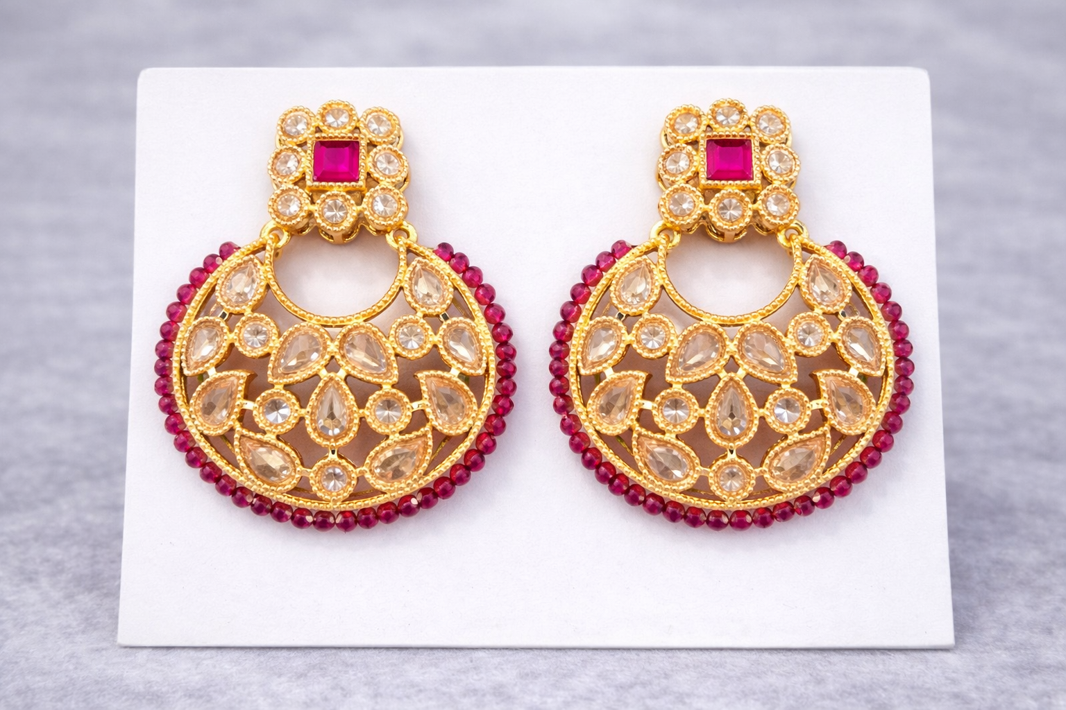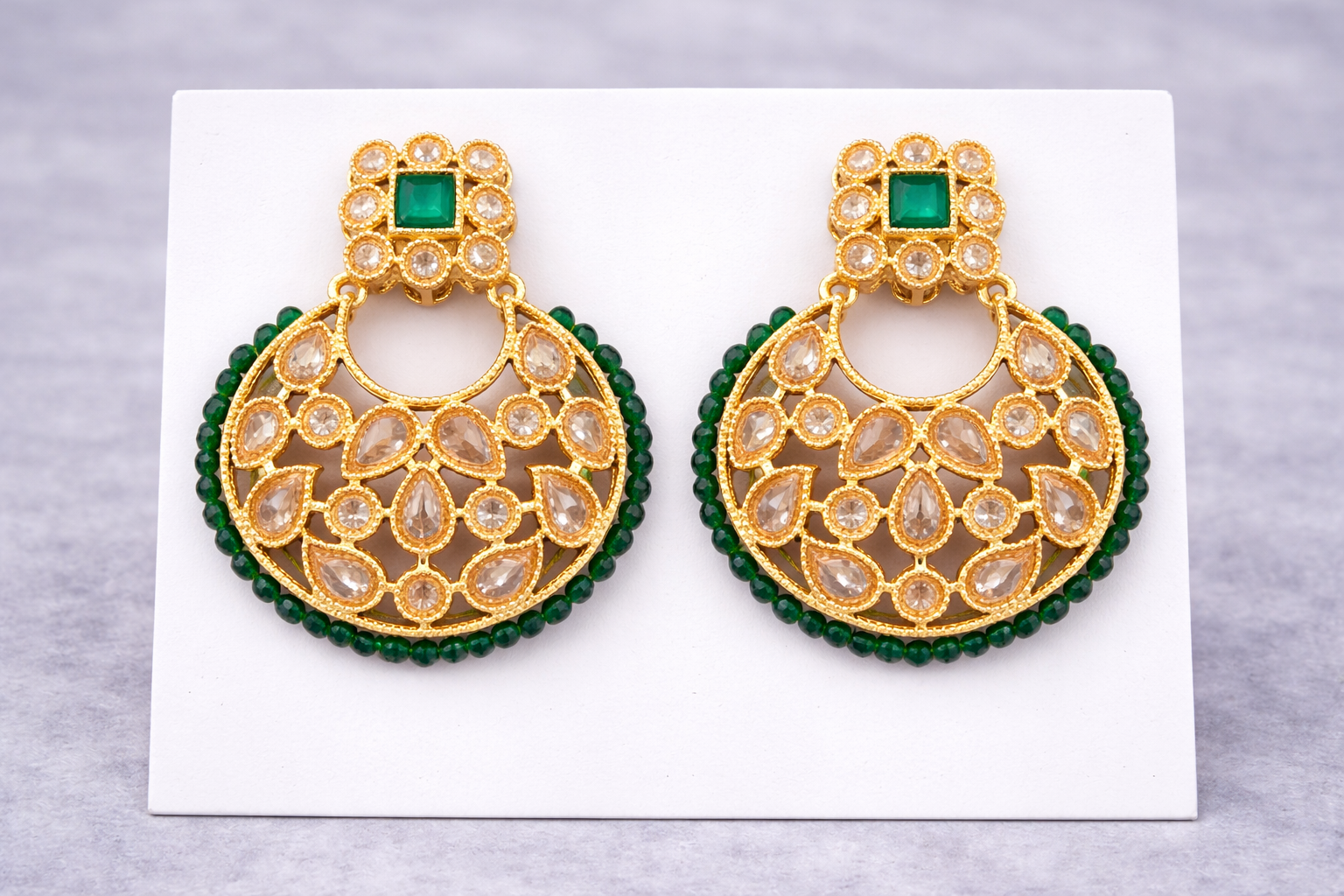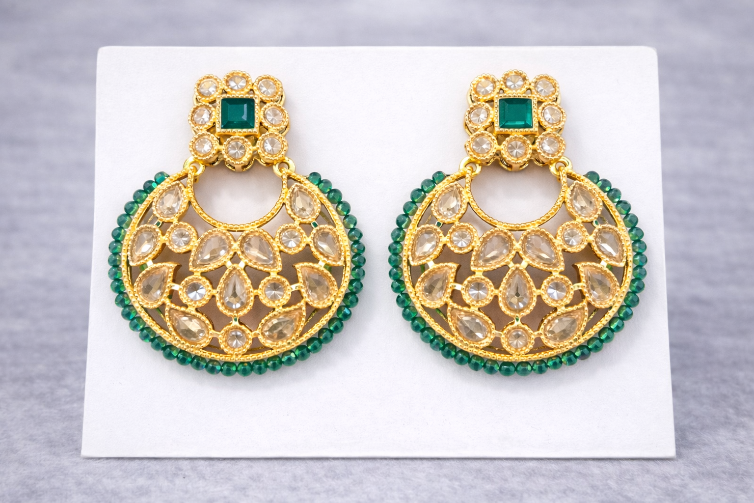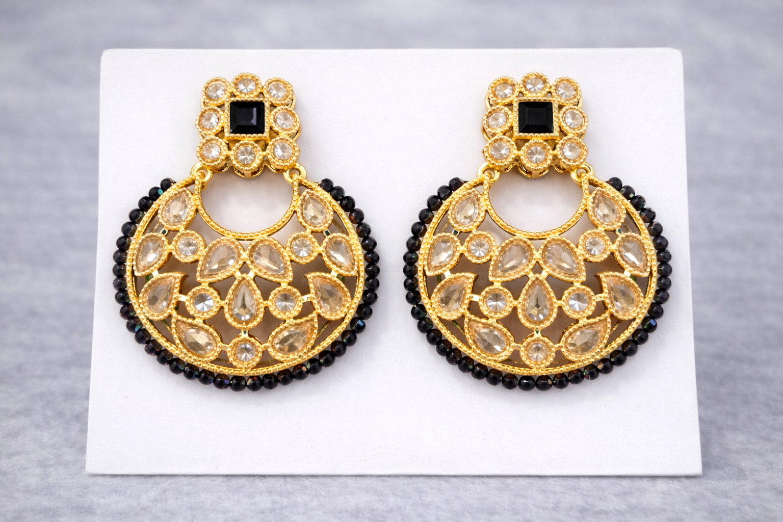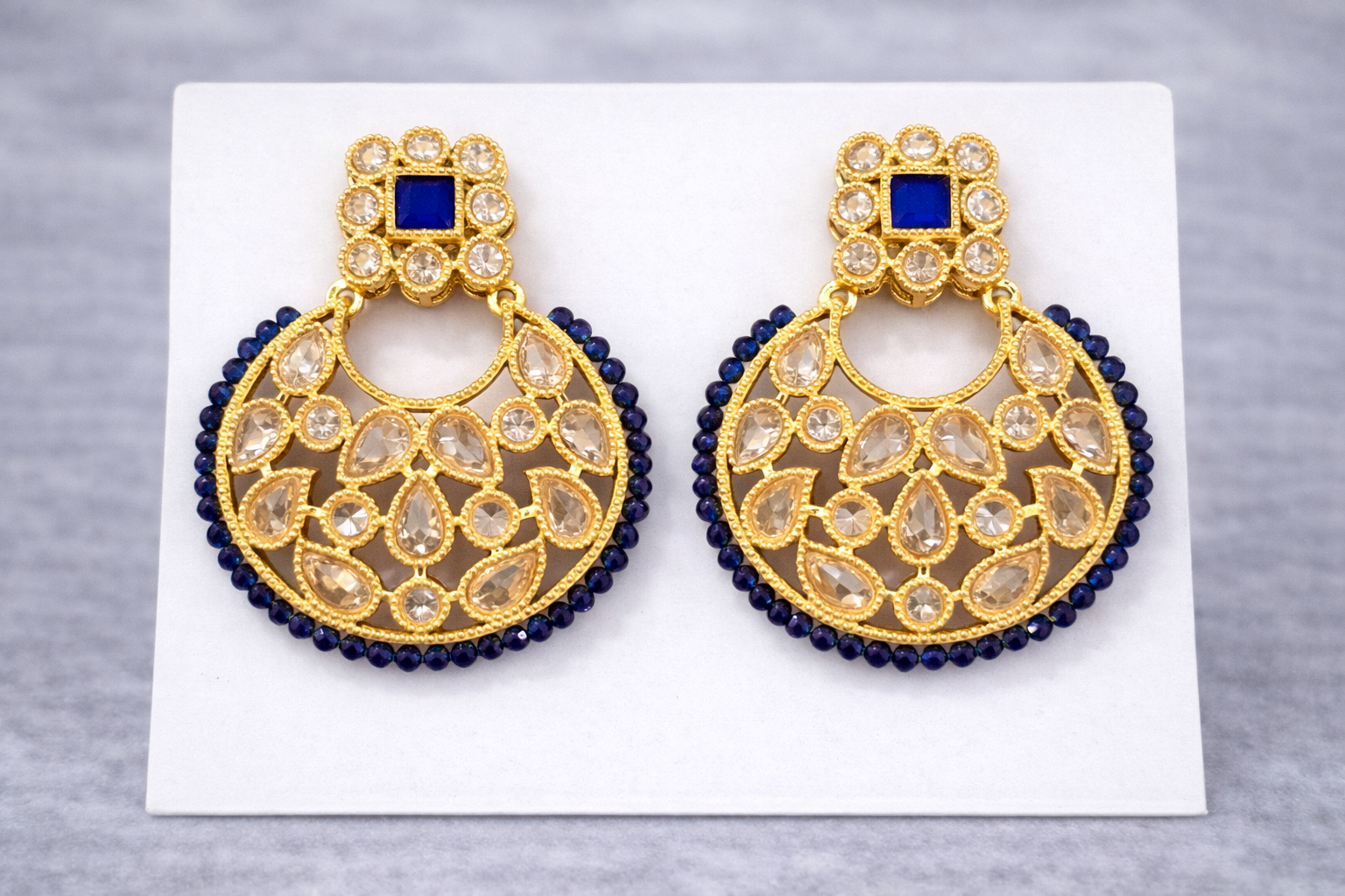 Elegant gold-tone crescent earrings featuring sparkling clear kundan stones with a rich midnight blue accent. Designed with intricate filigree detailing, a square blue stone stud top, and a delicate border of deep blue beads, these earrings offer a refined and luxurious look. Perfect for evening wear, weddings, and festive occasions, they pair beautifully with sarees, lehengas, and contemporary ethnic outfits for a graceful statement.