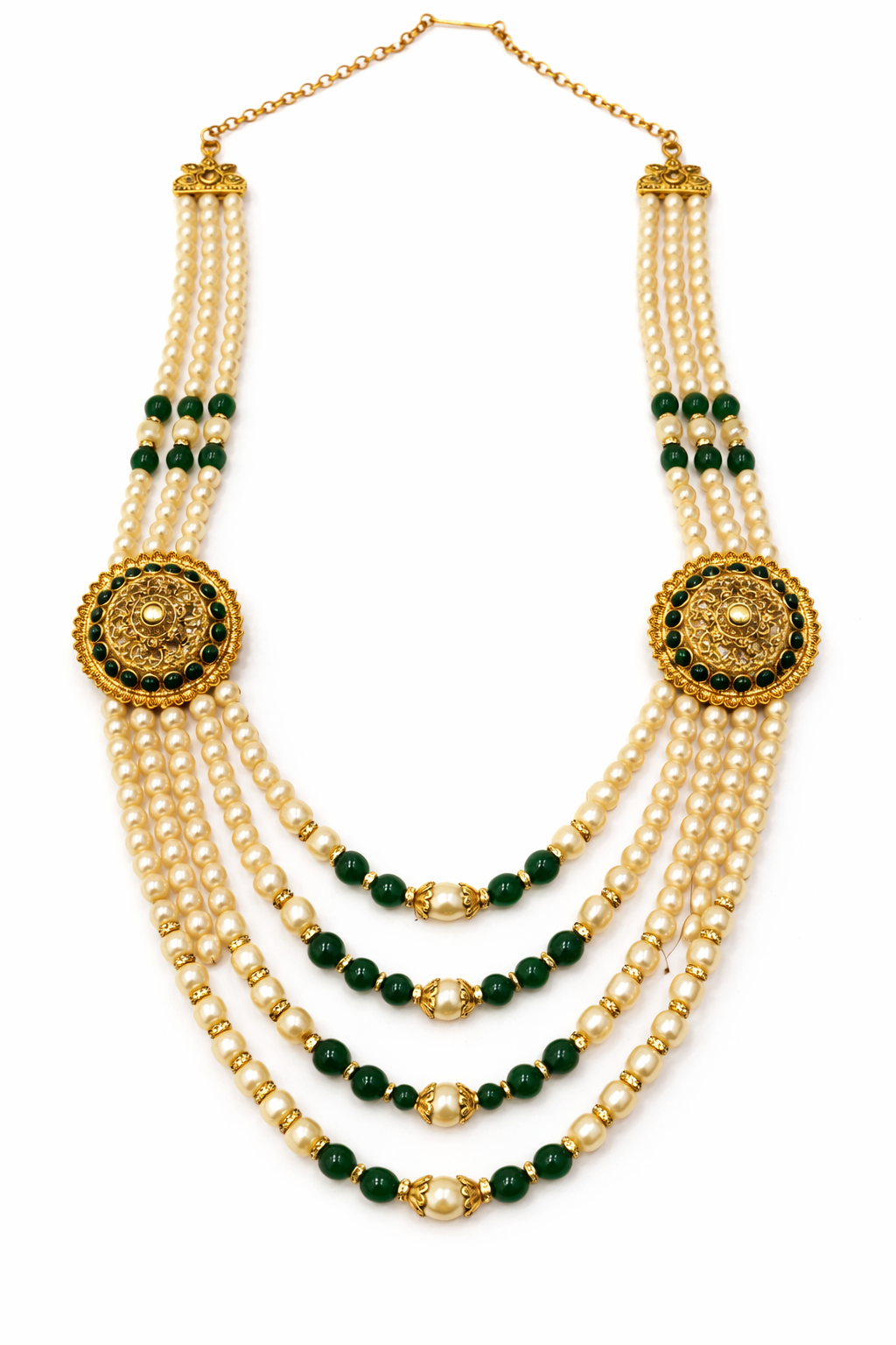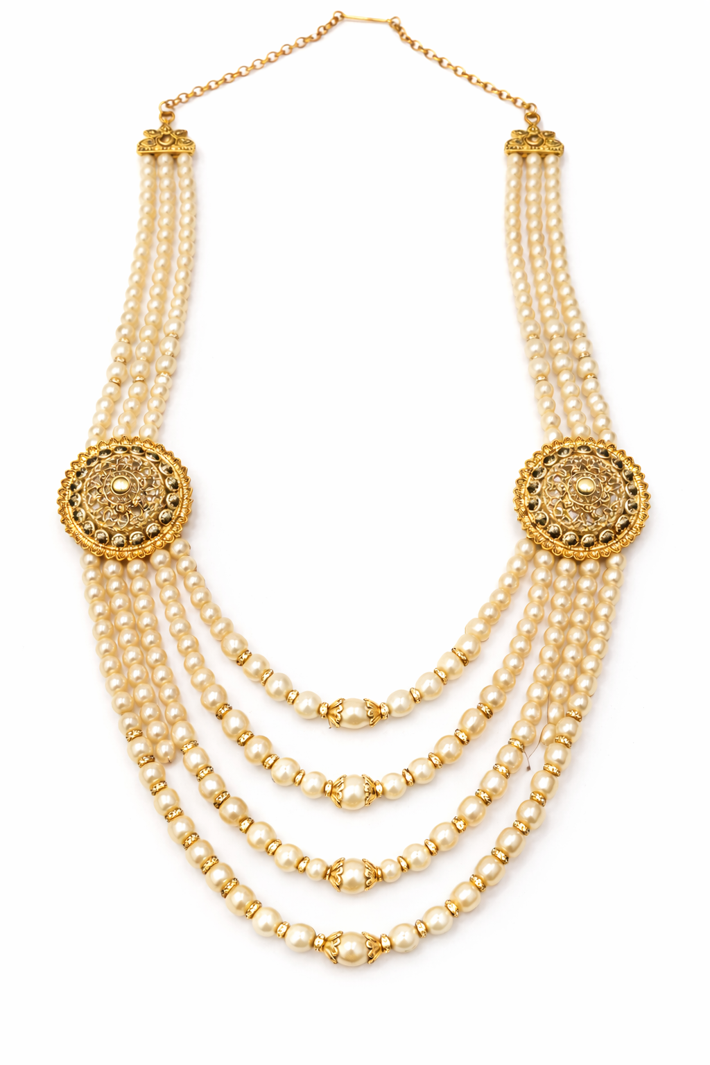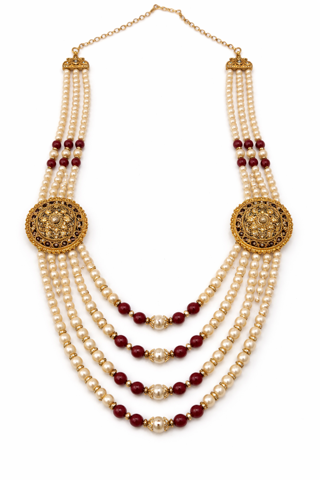A majestic Dulha-style moti mala crafted to reflect traditional bridal grandeur. This elegant necklace features multiple layered strands of lustrous white pearls, beautifully accented with rich maroon beads and gold-tone spacers for a classic royal look. The design is enhanced with ornate circular gold motifs on both sides, intricately detailed with traditional patterns that add depth and heritage charm.Perfect for festive occasions, this moti mala pairs exquisitely with outfits, making it an ideal choice for weddings and special ceremonies.