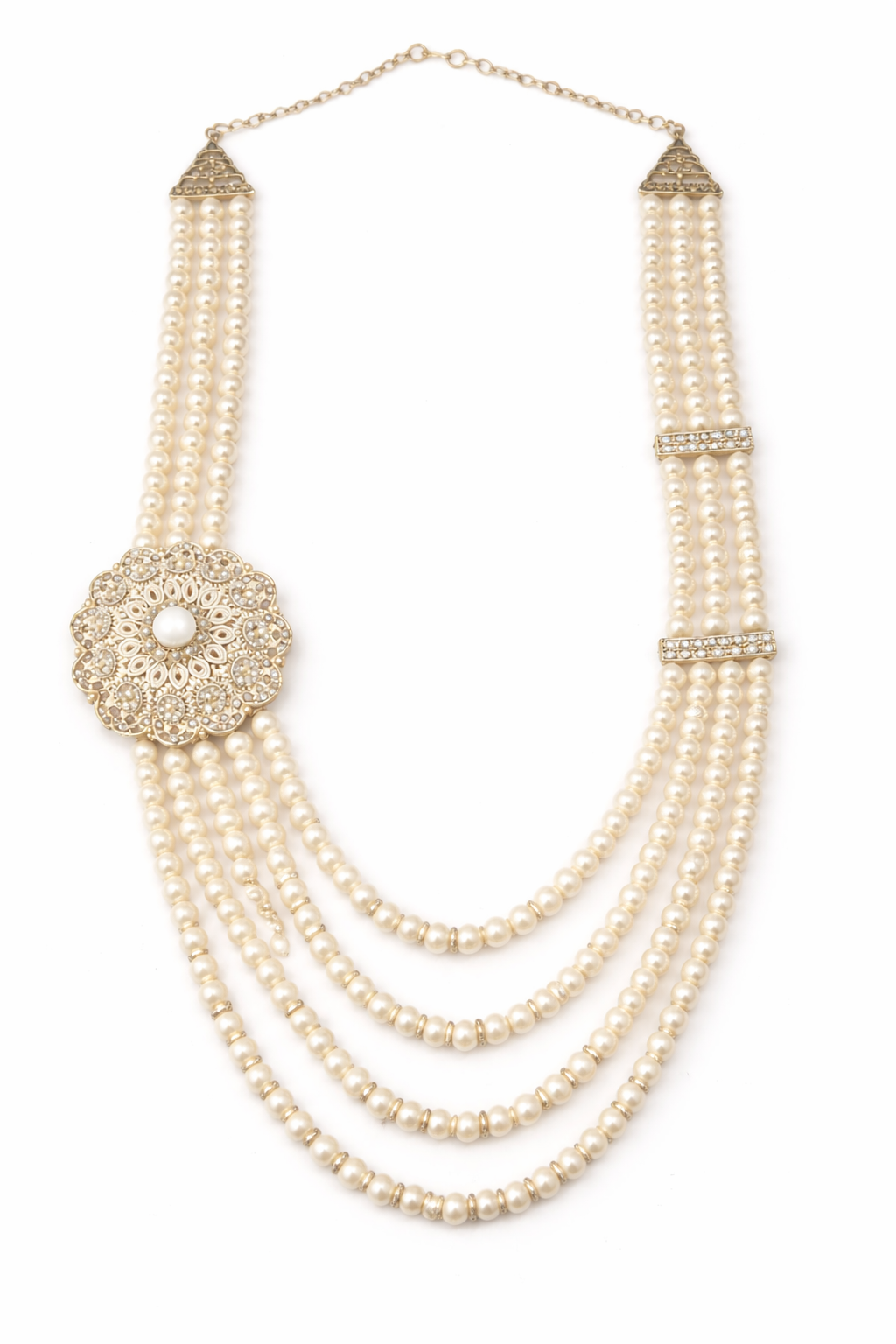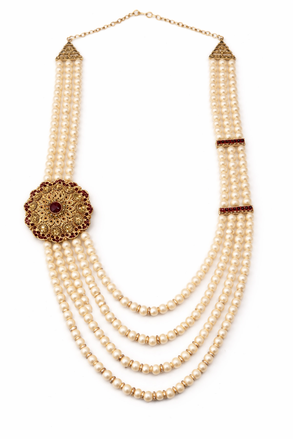 A timeless necklace crafted with multiple strands of lustrous ivory pearls, beautifully accented with rich maroon stones and antique gold detailing. The elegant floral medallion centerpiece, highlighted with a deep maroon stone, adds a regal touch inspired by traditional Indian craftsmanship. Delicate maroon stone spacers enhance the layered pearl strands, creating a graceful and luxurious silhouette.