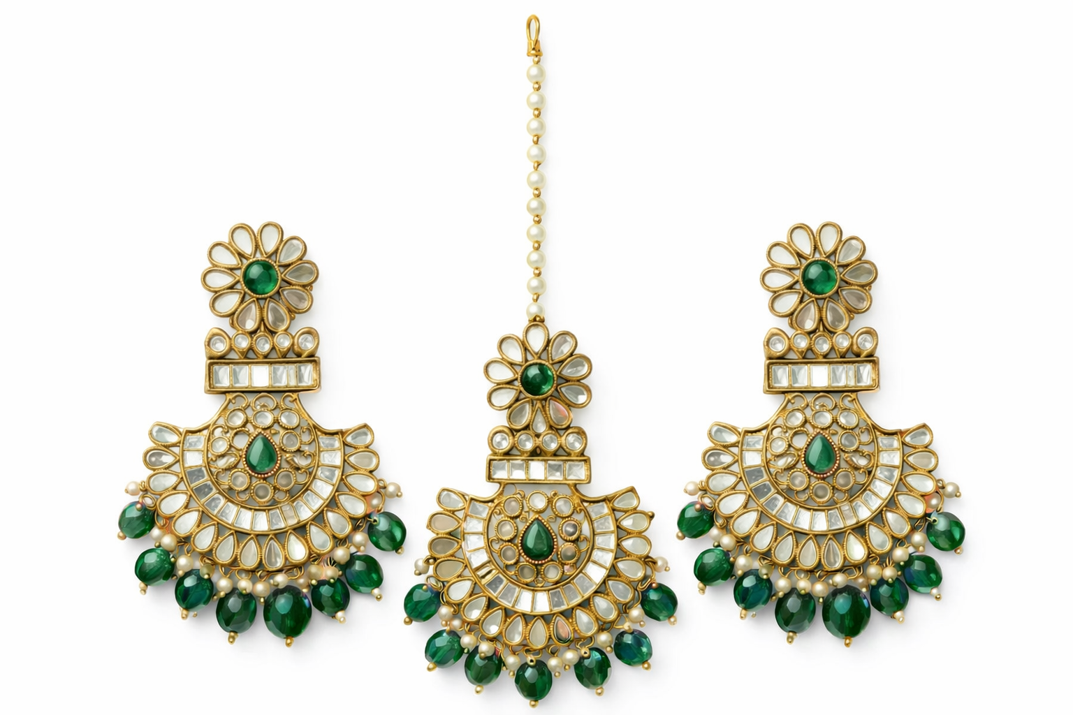 Elevate your ethnic look with this stunning Earring & Matching Maang Tikka Set, crafted in an elegant traditional design perfect for weddings and festive occasions. The set features intricate gold-tone detailing adorned with shimmering white stones and rich Mehendi Green accents that add a graceful, regal charm.The crescent-shaped earrings are beautifully highlighted with floral motifs on top, a teardrop mehendi green stone at the center, and delicate pearl and bead drops that create a graceful movement. The matching maang tikka mirrors the same design, complete with a pearl chain for a classic bridal finish.