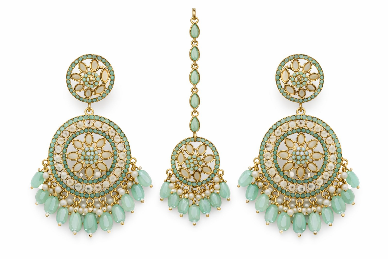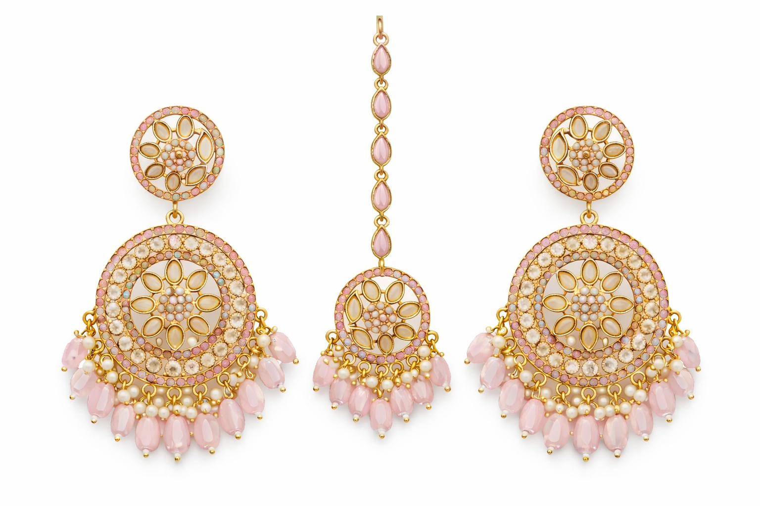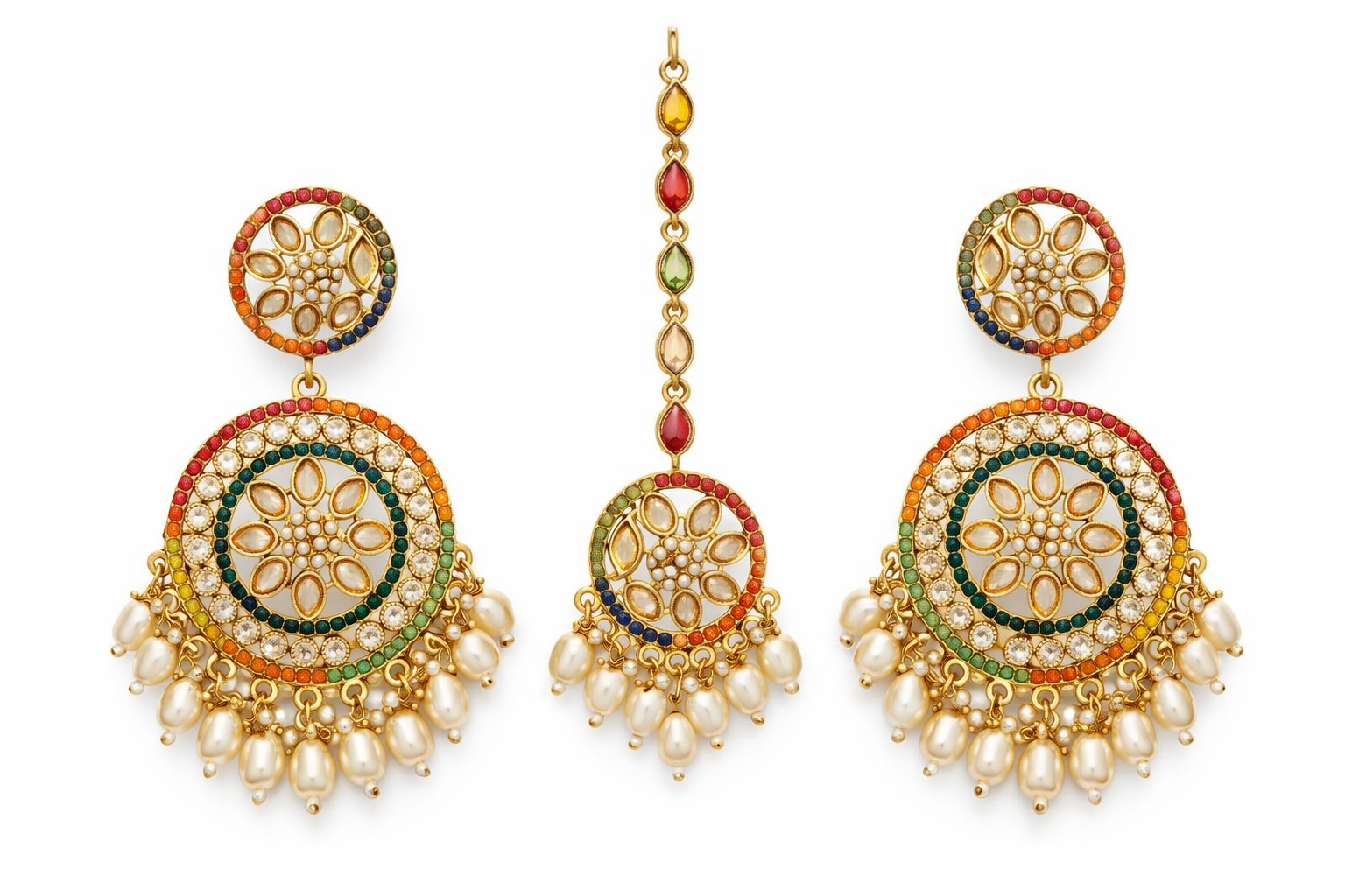 Make a graceful statement with this exquisite Kundan earrings and maang tikka set, crafted to perfection for festive and bridal wear. Featuring intricate circular motifs, the design is adorned with premium-quality stones, delicate pearl detailing, and rich enamel work that adds depth and elegance.The chandelier-style earrings are beautifully finished with dangling bead drops, giving a luxurious movement and royal appeal. The matching maang tikka complements the earrings perfectly, creating a complete traditional look ideal for weddings, receptions, festivals, and special occasions.Finish: Gold-tonedStyle: Traditional / Bridal / FestiveSet Includes: 1 Pair Earrings + 1 Maang TikkaOccasion: Wedding, Engagement, Festive Functions, Parties