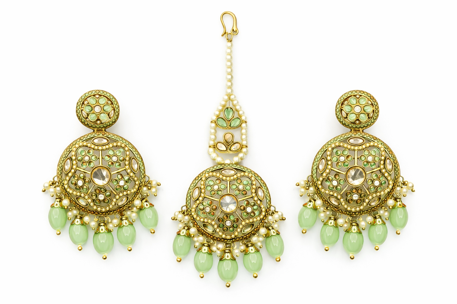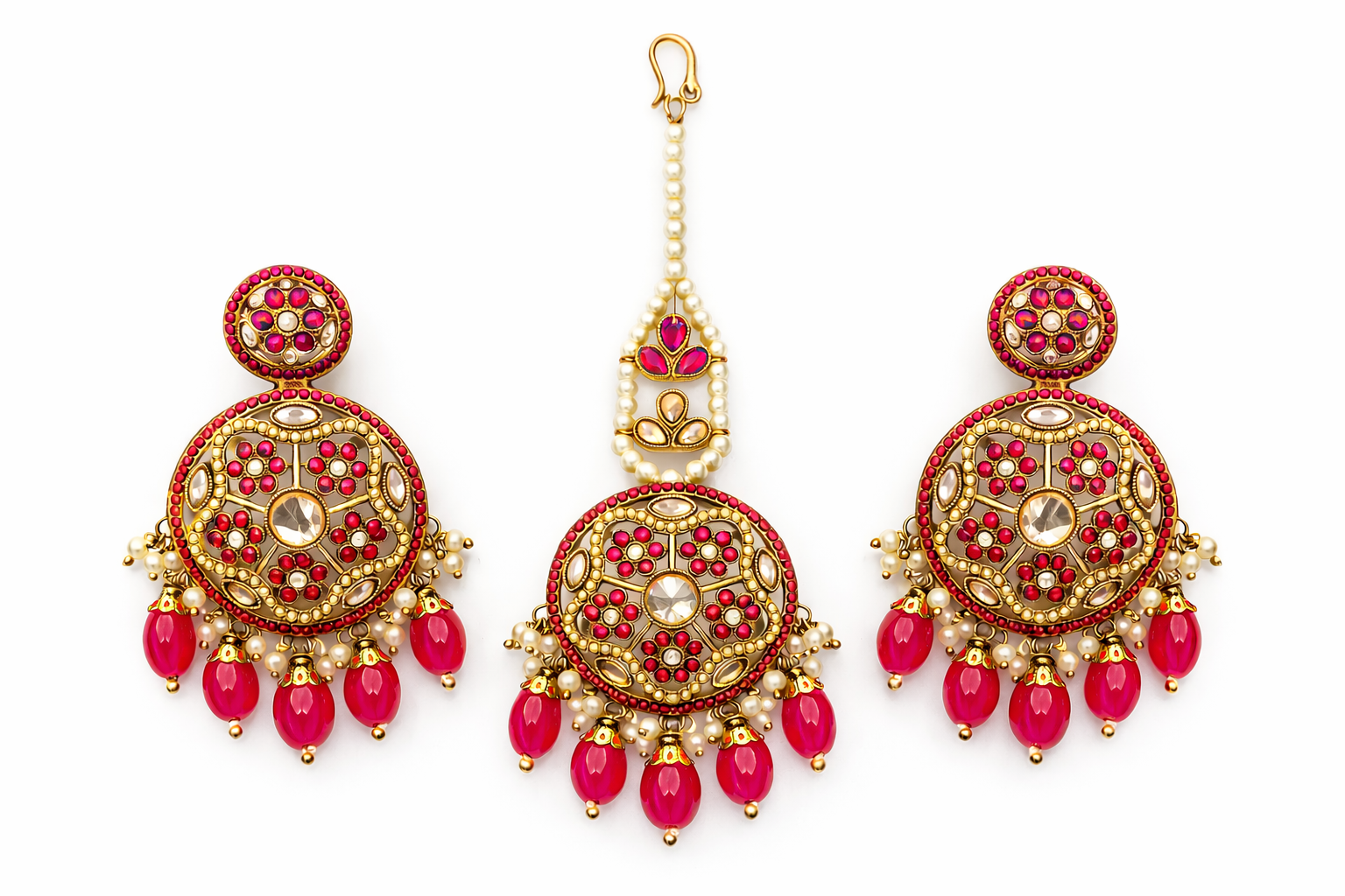 Make a bold and elegant statement with this stunning Rani Pink Kundan earrings and maang tikka set. Crafted in a rich gold-tone finish, the set features intricate floral kundan detailing highlighted with vibrant rani pink stones and graceful bead drops. The delicate pearl accents and detailed craftsmanship add a royal touch, making this set truly eye-catching.Perfect for weddings, mehndi, sangeet, festive celebrations, and traditional occasions, this set pairs beautifully with lehengas, sarees, and anarkalis. Designed to stand out while remaining lightweight and comfortable.Finish: Gold-toneStone: Kundan with rani pink beads & pearl detailingSet Includes: 1 Pair Earrings + 1 Matching Maang TikkaStyle: Bridal | Festive | Traditional