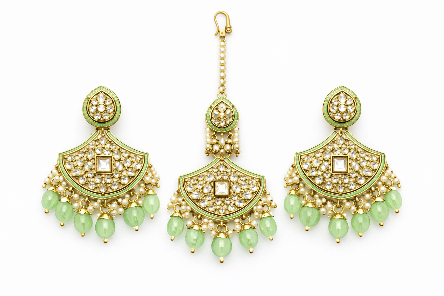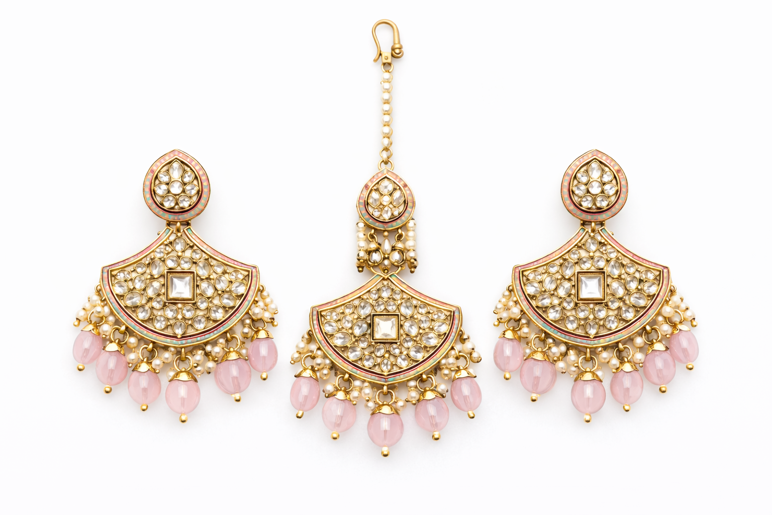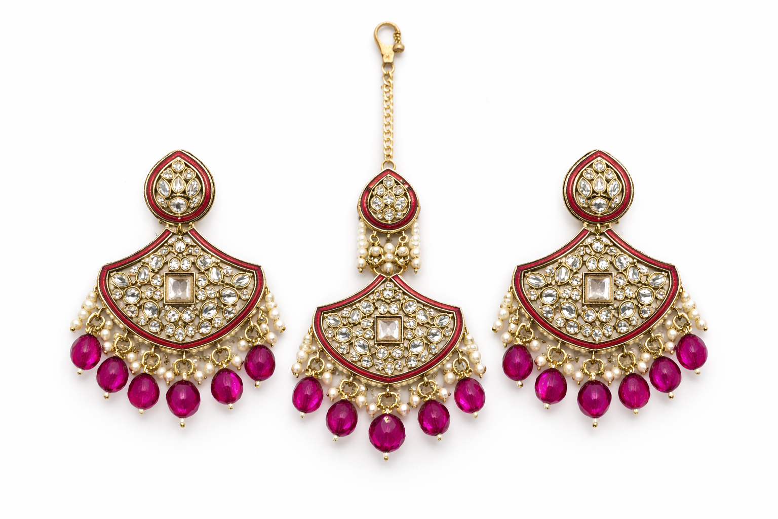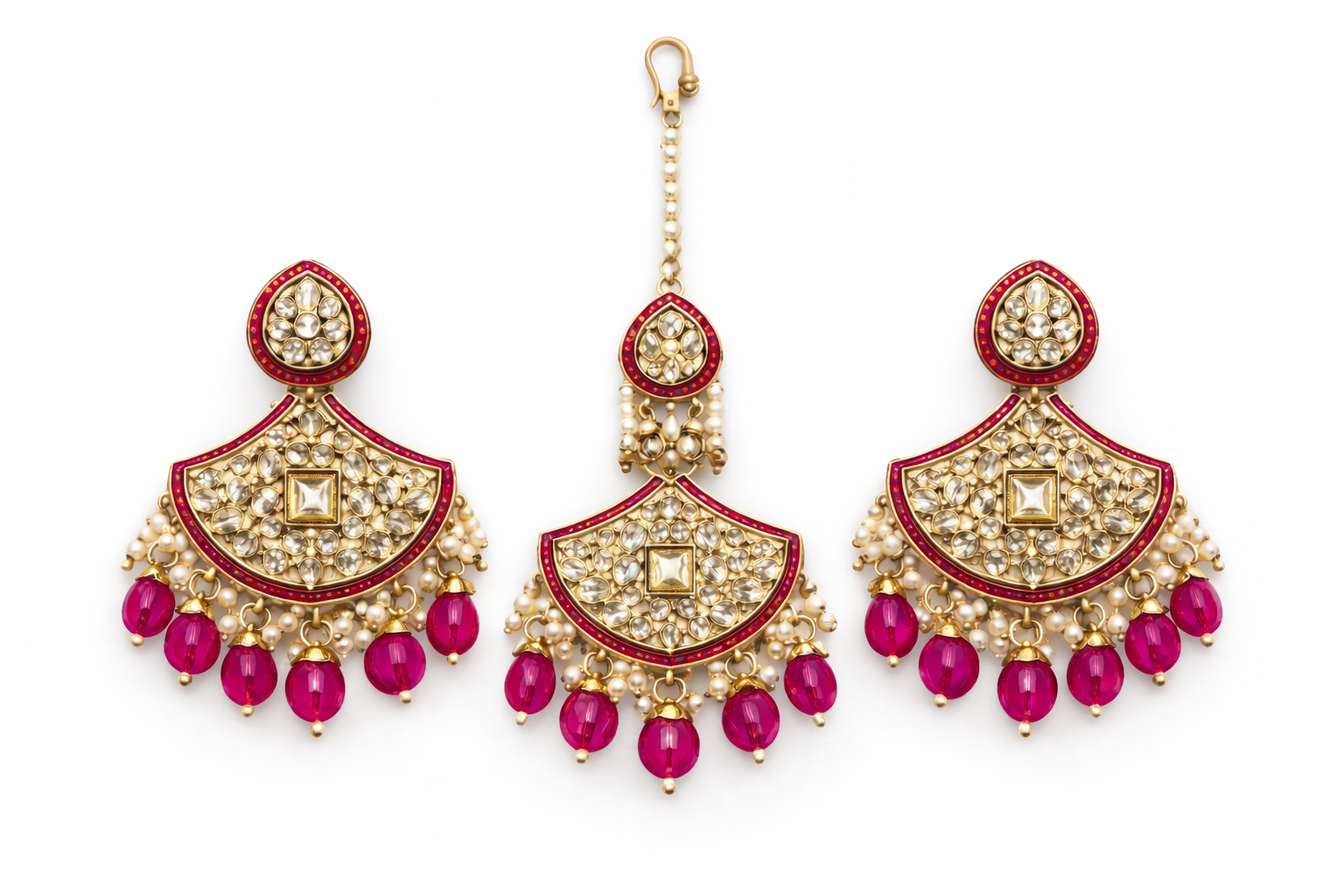 Elevate your festive and bridal look with this exquisite Rani Pink Kundan earrings and maang tikka set. Crafted in an elegant gold-tone finish, the design features finely set Kundan stones framed with rich rani pink enamel accents. The graceful dangling rani pink beads and soft pearl detailing add movement and a luxurious traditional charm.The crescent-shaped silhouette paired with intricate stonework makes this set a timeless choice for weddings, receptions, mehndi, sangeet, and festive occasions. Lightweight yet striking, it pairs beautifully with lehengas, sarees, and anarkalis.Finish: Gold-toneStone: Kundan with rani pink beads & pearl accentsSet Includes: 1 Pair Earrings + 1 Matching Maang TikkaStyle: Bridal | Festive | Traditional