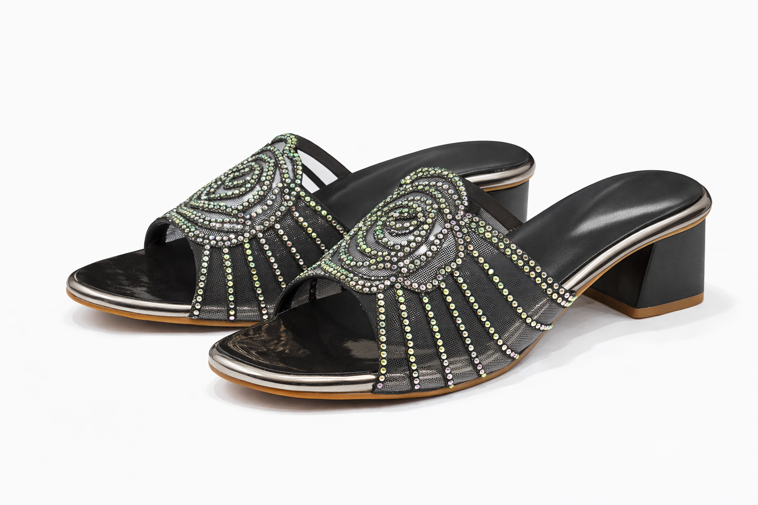 Make a bold yet elegant statement with these stunning block-heel sandals, designed to blend glamour with everyday comfort. Featuring a sheer mesh upper adorned with intricate swirl and vertical rhinestone detailing, these heels catch the light beautifully while maintaining a refined, modern look. The open-toe design paired with a sleek slip-on style makes them effortlessly stylish and easy to wear.Set on a sturdy block heel with a cushioned insole, these sandals provide excellent support and balance, making them ideal for long hours of wear. Perfect for evening outings, festive occasions, parties, or pairing with both ethnic and western outfits, they add just the right amount of sparkle to your ensemble.