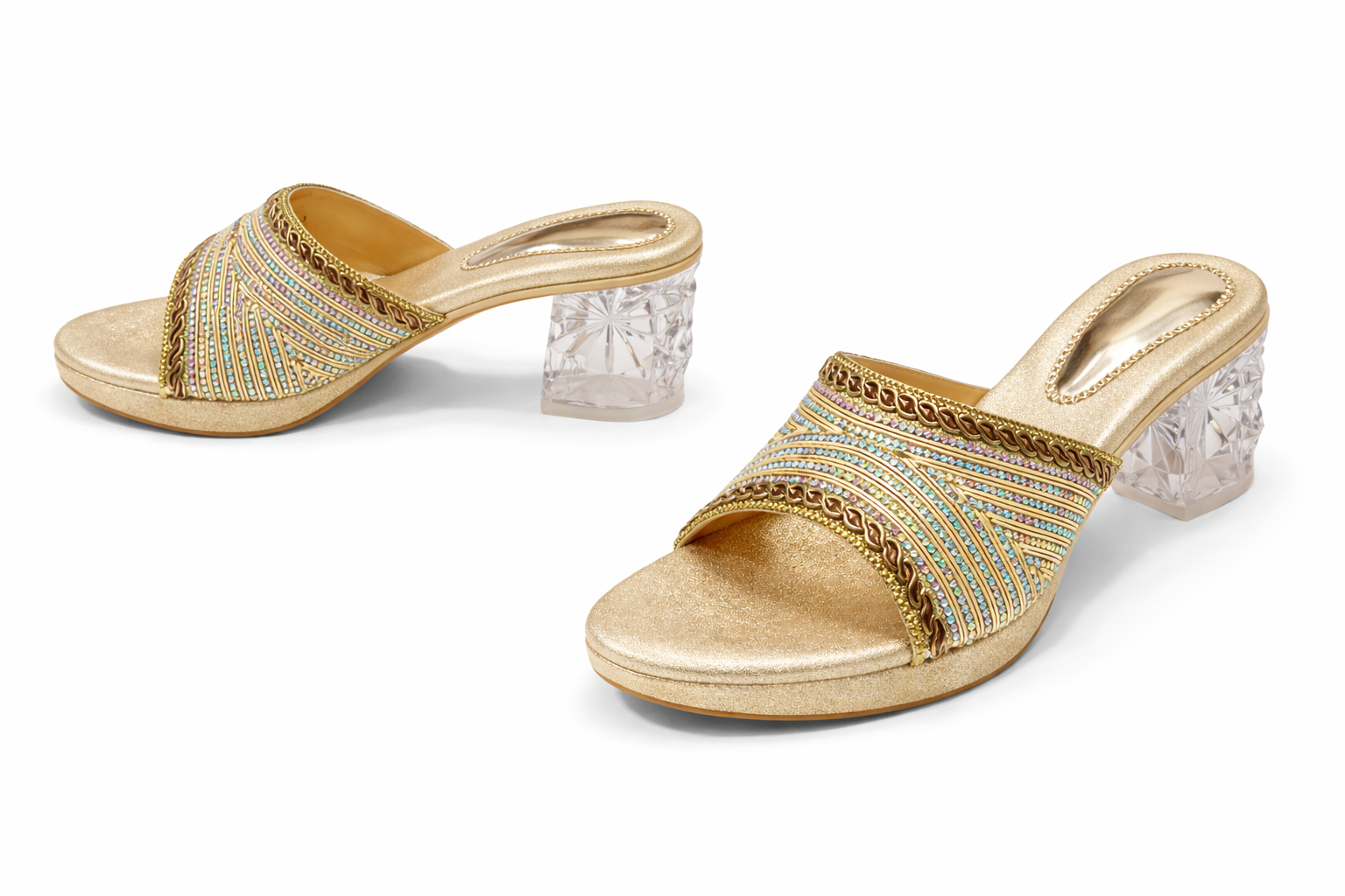 Add a touch of luxury to your festive wardrobe with these stunning gold mule heels. Designed with intricate multicolour rhinestone detailing and rich gold threadwork, this pair features a unique transparent crystal block heel that elevates the look while offering excellent stability. The soft cushioned footbed ensures comfort, making it perfect for long celebrations.