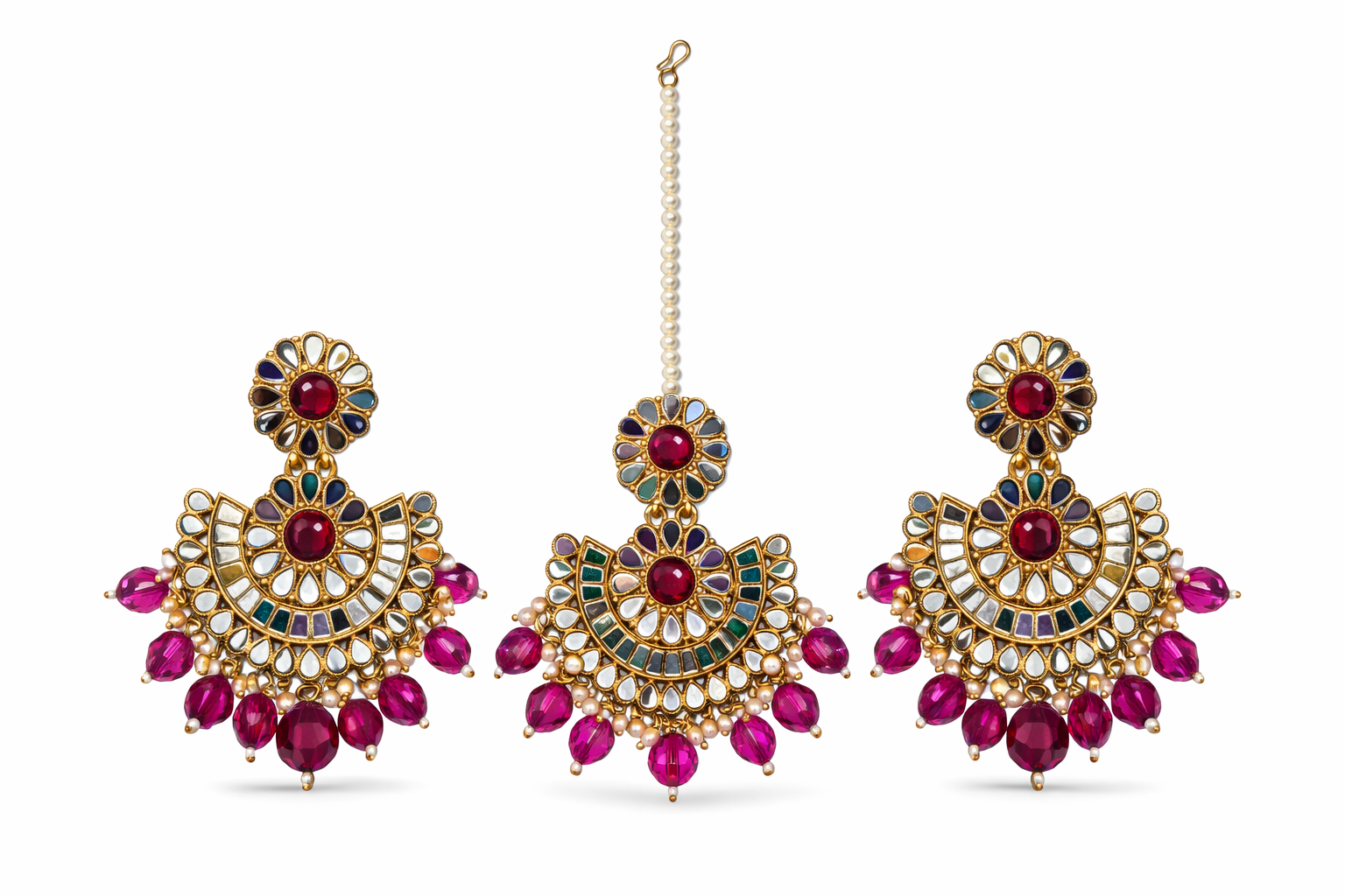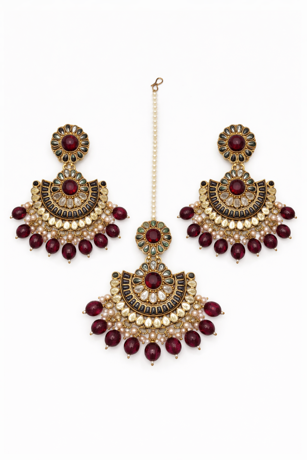 Add regal elegance to your bridal and festive look with this stunning Kundan jhumka set, featuring beautifully coordinated earrings and a matching maang tikka. Crafted in an antique gold-tone finish, the design showcases finely set clear Kundan stones arranged in intricate crescent and floral motifs. Rich maroon bead drops enhance the set with a luxurious depth of colour and graceful movement.The maang tikka mirrors the earring design, creating a perfectly balanced and cohesive traditional ensemble. Ideal for weddings, receptions, and festive occasions, this set pairs effortlessly with sarees, lehengas, and anarkalis.