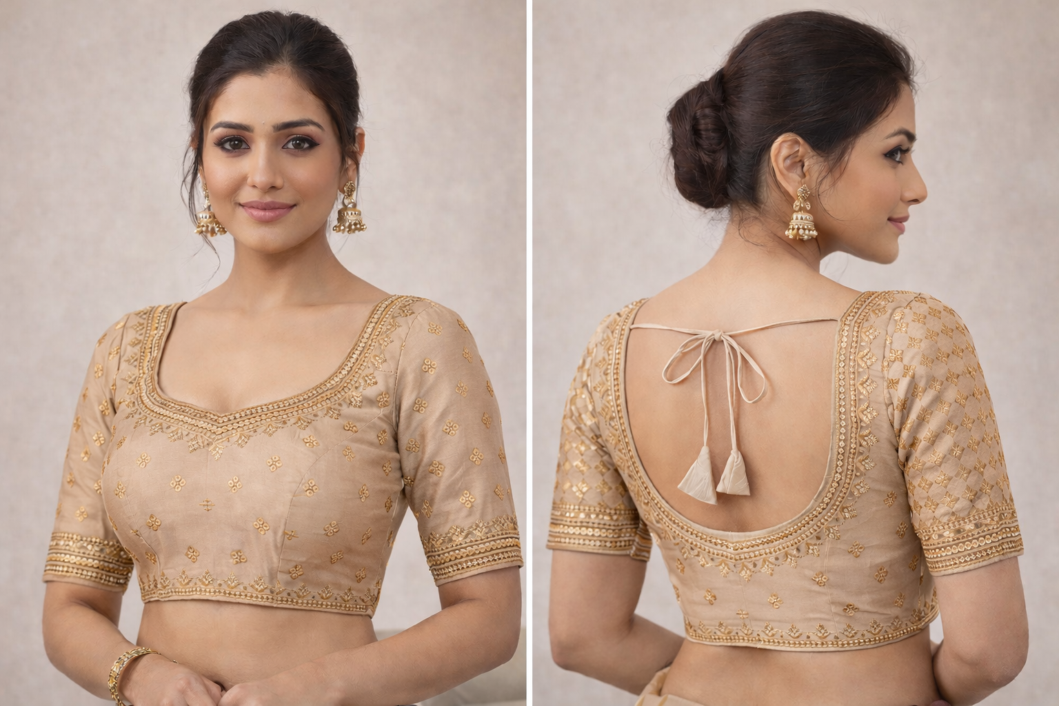 Elevate your saree look with this elegant beige blouse, beautifully highlighted with rich gold embroidery. Crafted on a smooth, lustrous fabric, the blouse features delicate buti motifs all over, paired with intricate embroidered borders on the neckline, sleeves, and hem.The front showcases a classic scoop neckline that flatters the silhouette, while the back is designed with a deep U-shaped cut, finished with adjustable tie-up dori and tassels for a graceful traditional touch. Short sleeves with detailed gold work add to its festive appeal.Perfect for weddings, festive occasions, receptions, and traditional functions, this blouse pairs effortlessly with silk, chiffon, georgette, and net sarees.Fabric: Silk blend / Art silkNeckline: Scoop neck (front)Back Style: Deep U-back with dori tie-upSleeves: Short sleeves with embroidered borderWork: Gold embroidery & woven motifsOccasion: Festive, Wedding, Party, Traditional wear