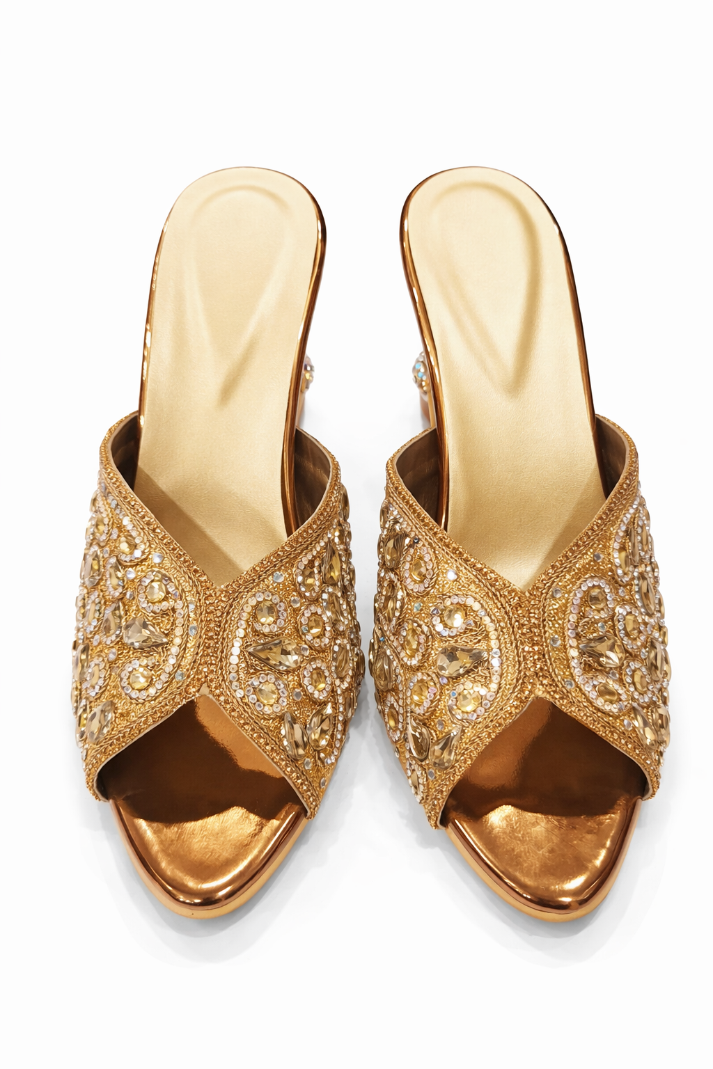 Make a statement at every special occasion with these exquisite ladies’ ethnic mule heels, designed to blend timeless elegance with modern glamour. Crafted in a rich gold tone, the upper features intricate embroidery highlighted with sparkling stones, crystals, and delicate beadwork arranged in an ornate pattern for a luxurious finish.The open-toe mule design offers effortless wear, while the softly cushioned insole provides comfort with every step. The standout sculpted heel, embellished with shimmering crystal accents, adds a unique designer touch and stable support. Perfect for weddings, receptions, festive celebrations, and evening events, these heels pair beautifully with sarees, lehengas, gowns, and Indo-western outfits.