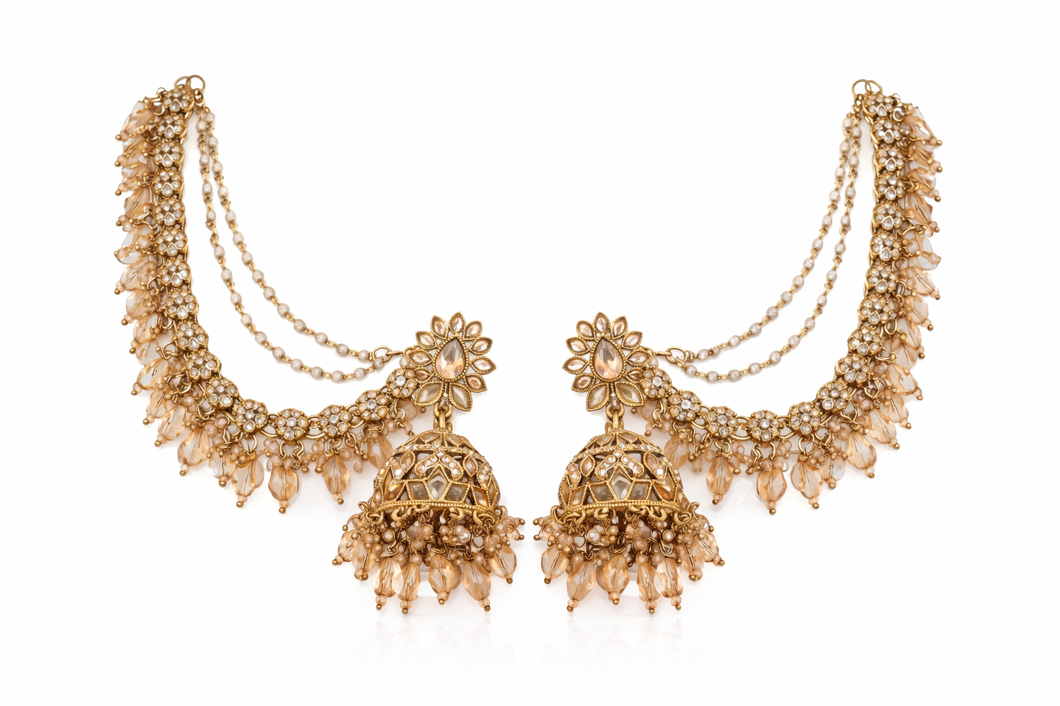Add refined elegance to your ethnic ensemble with these stunning Champagne Gold Jhumka Earrings, crafted in an antique gold-tone finish. The floral stud design is embellished with soft champagne-colored crystals, flowing into intricately carved dome-shaped jhumkas. Layers of delicate crystal drops and subtle pearl accents create graceful movement and a luminous, luxurious appeal.