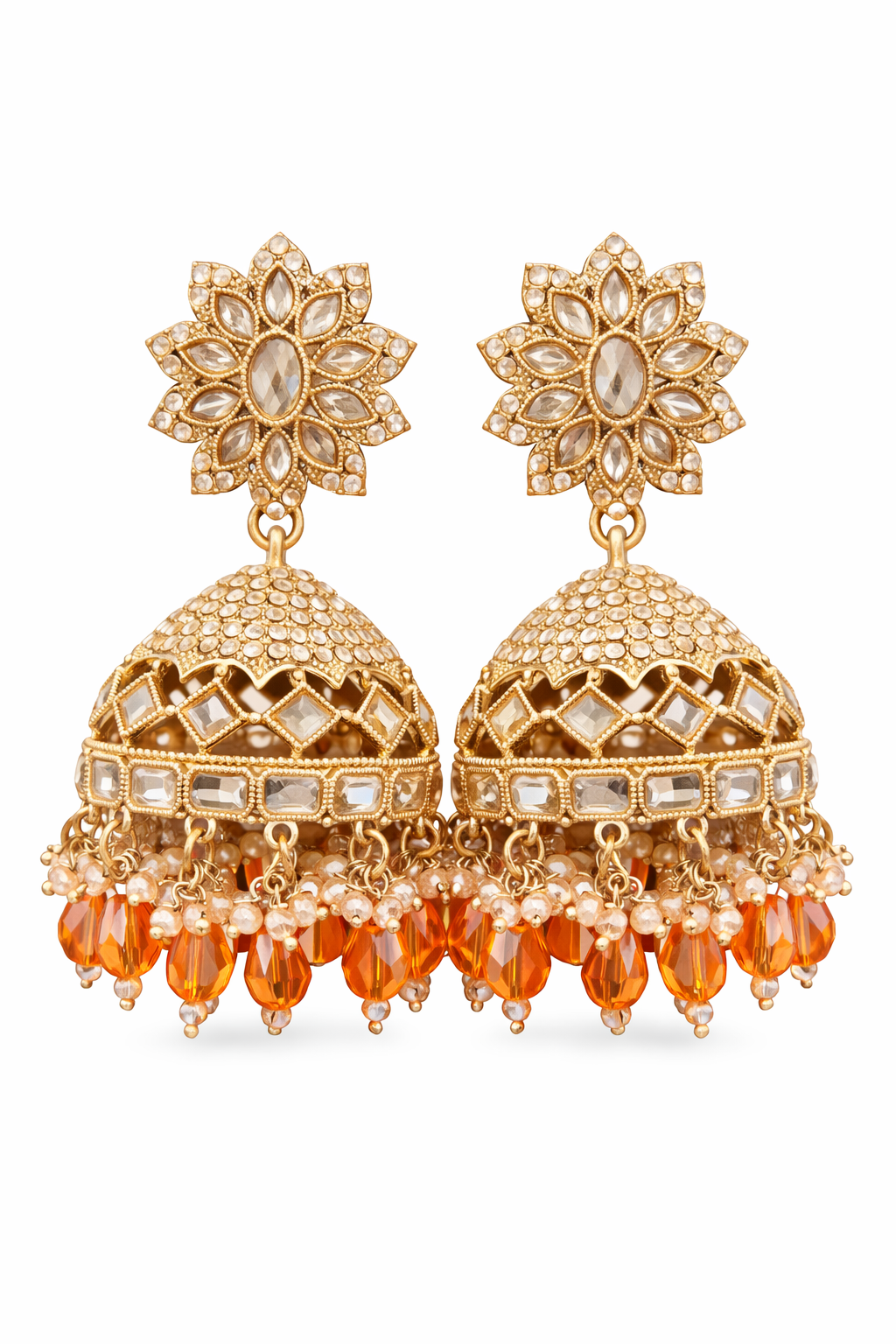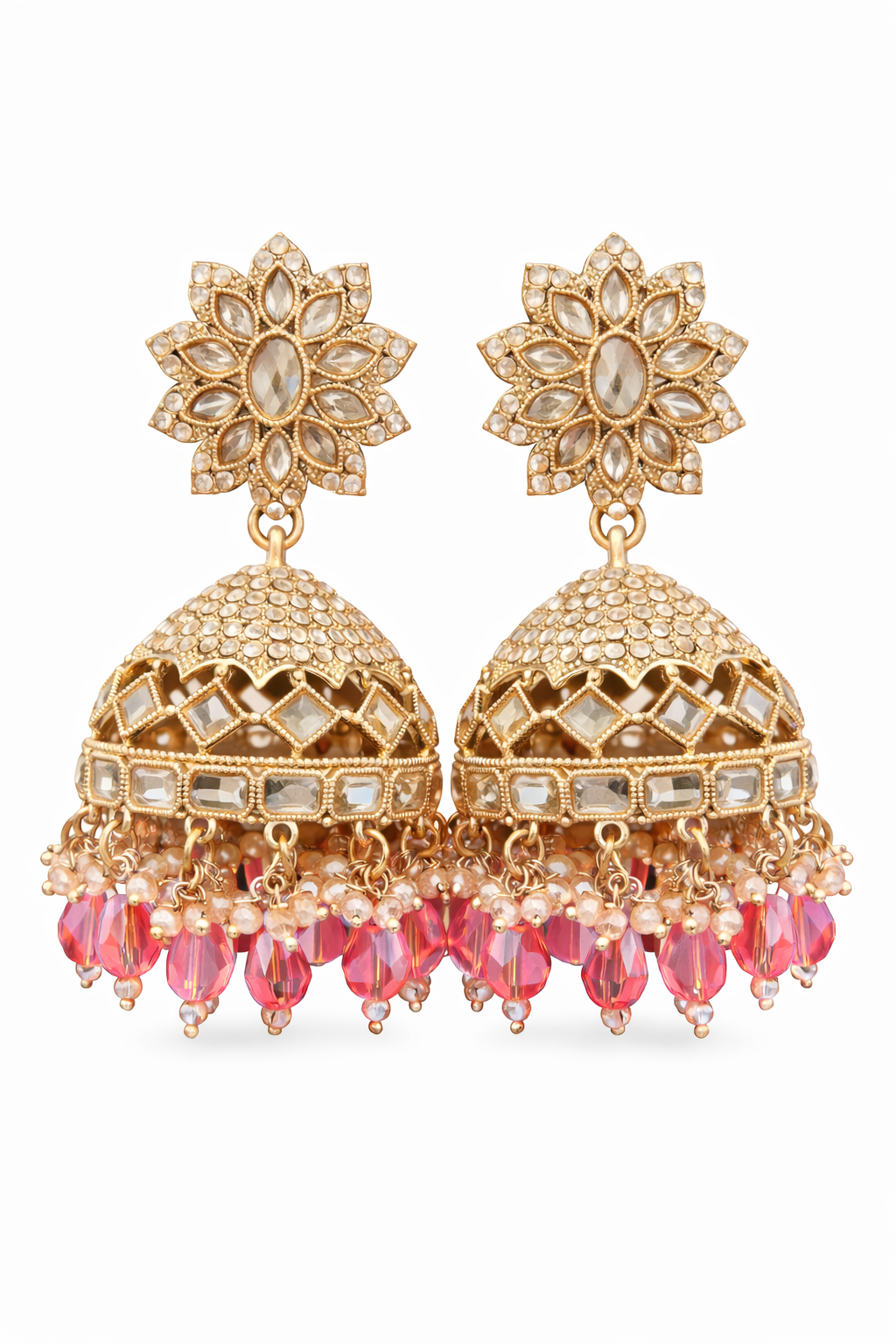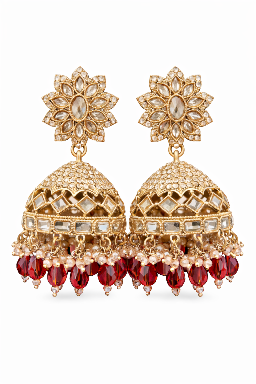 Add timeless elegance to your festive and bridal look with these stunning maroon kundan jhumka earrings. Crafted in a rich gold-tone finish, the floral stud is beautifully embellished with classic uncut kundan stones, leading to a finely detailed dome-shaped jhumka. The look is completed with a graceful cascade of deep maroon crystal drops and delicate pearl accents, creating a luxurious and eye-catching finish.Perfect for weddings, receptions, festive celebrations, and traditional occasions, these statement earrings pair effortlessly with sarees, lehengas, and anarkalis. Designed to make an impact while remaining comfortable for long wear.