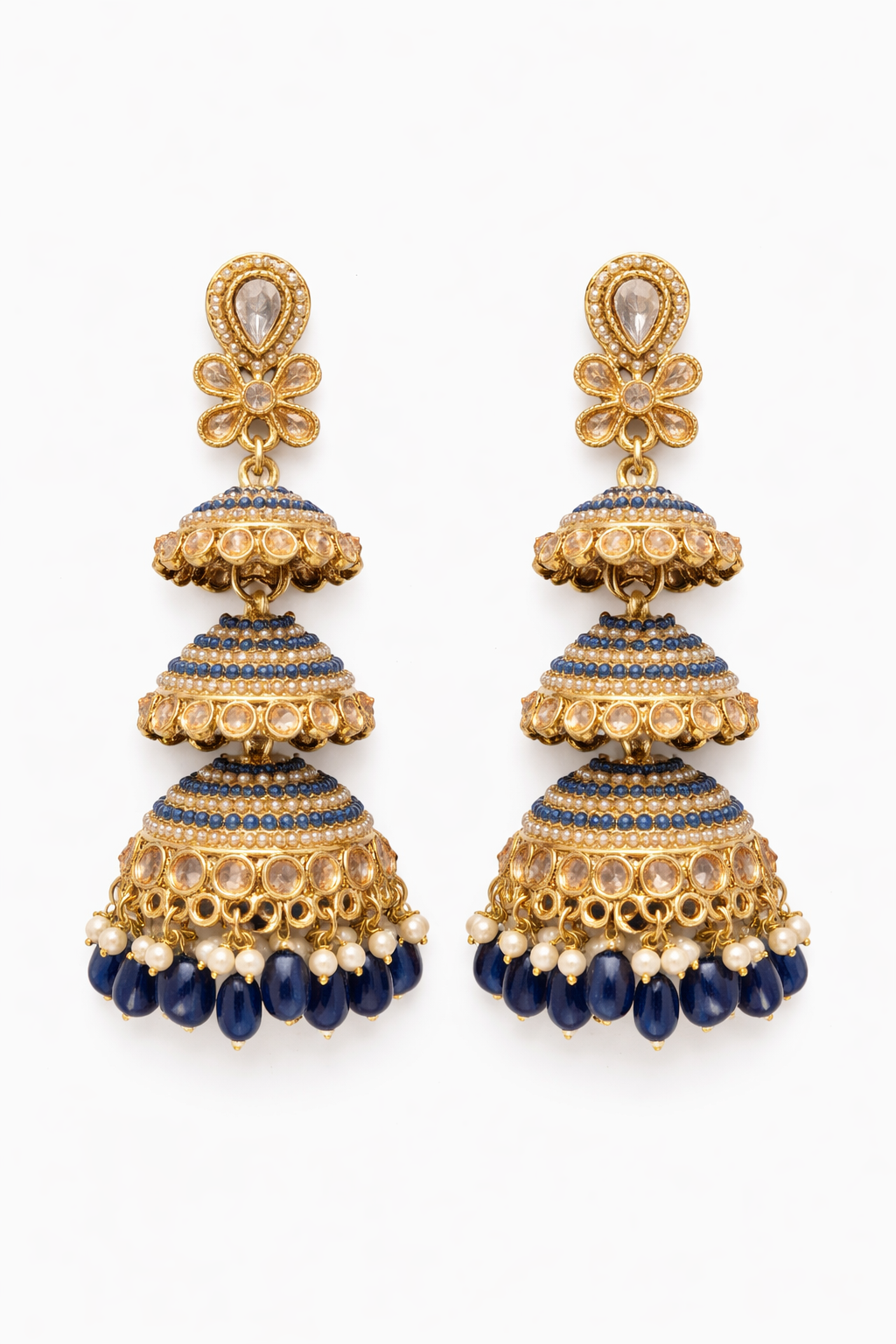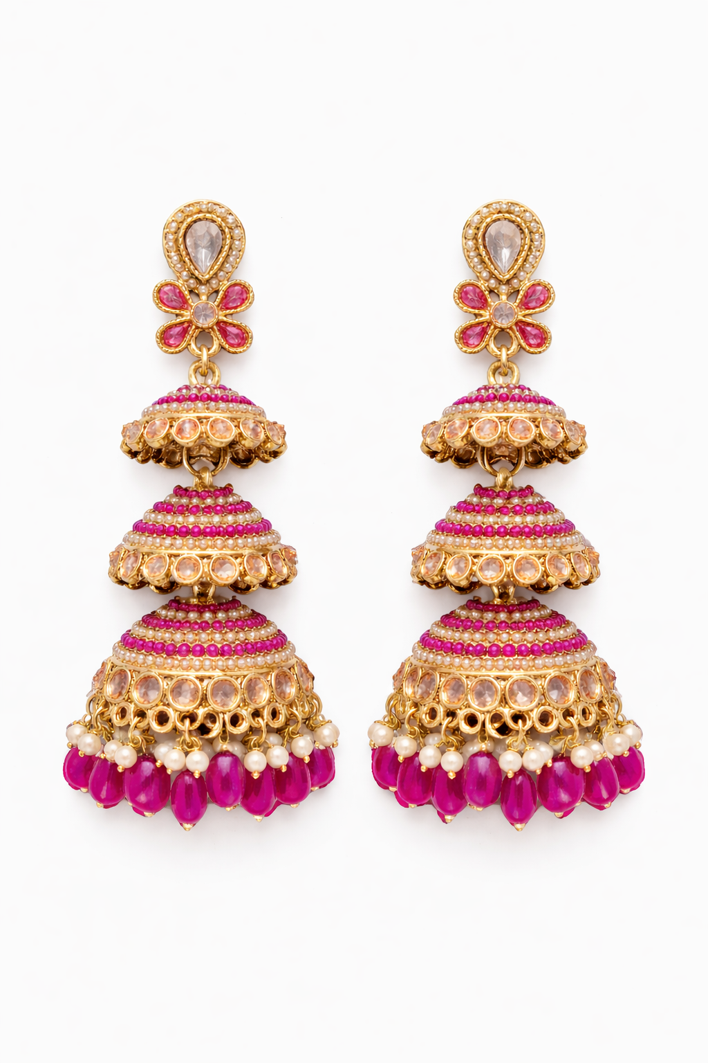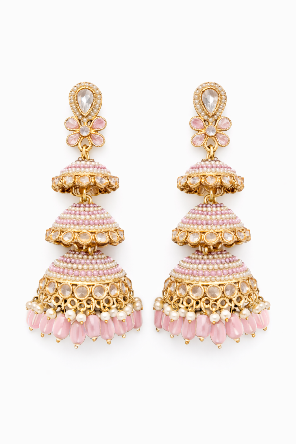 Add soft elegance to your festive jewellery collection with these beautifully crafted traditional jhumka earrings in a delicate light pink tone. Designed in a rich gold-tone finish, the earrings feature intricate kundan-style detailing with a tiered jhumka silhouette. Layers of fine pearl work and clear stones are gracefully complemented by light pink beads that add charm and gentle movement. Perfect for weddings, festive celebrations, and special occasions, these jhumkas pair effortlessly with sarees, lehengas, and pastel ethnic outfits.
