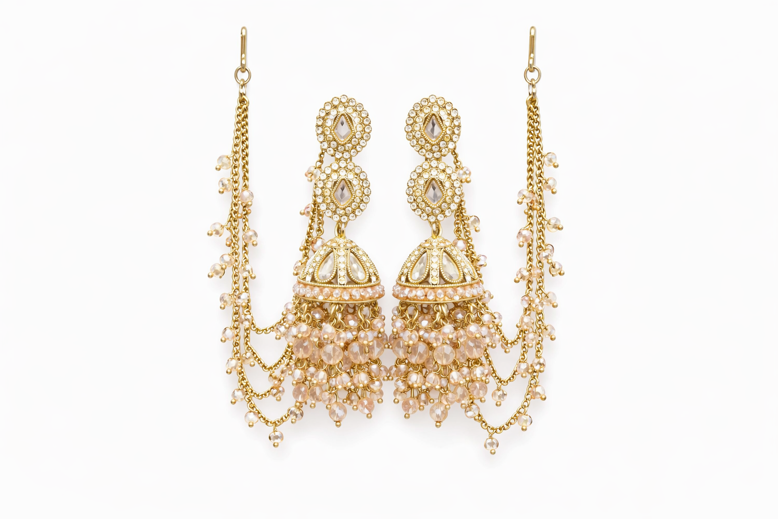 Make a graceful statement with these exquisite traditional jhumka earrings, beautifully crafted in a rich gold-tone finish. Designed with intricate kundan-style detailing, the earrings feature a double-layered stud highlighted with teardrop and floral motifs, leading to elegant jhumka domes. Soft blush-pink beads and delicate pearls cascade from the base, adding movement and a luxurious festive touch. The side chains enhance the traditional appeal, making this piece perfect for bridal wear, weddings, and special celebrations.