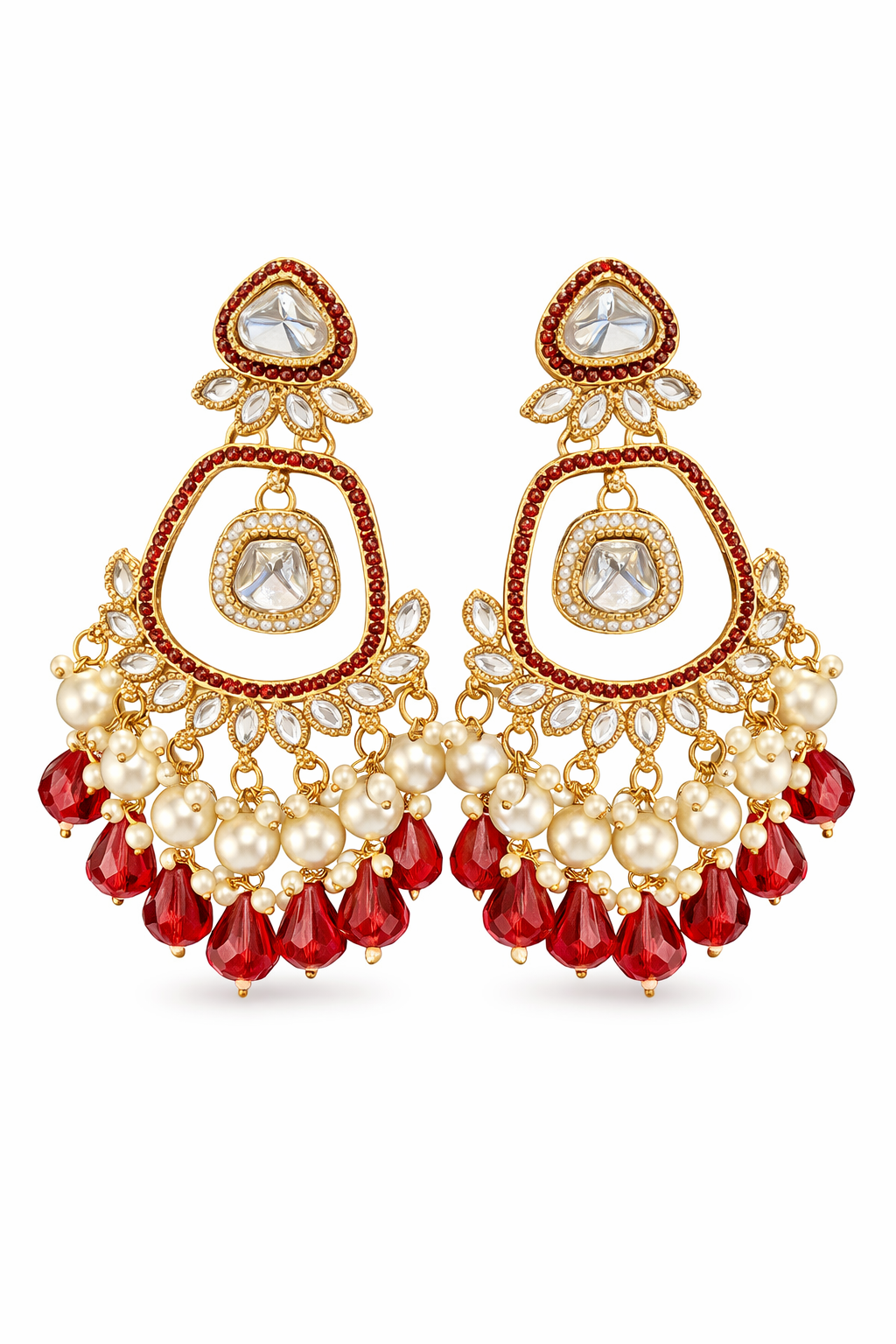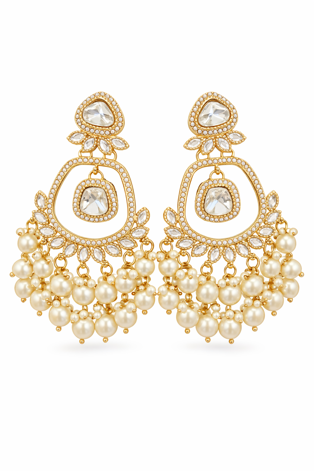 Elevate your festive and bridal look with these exquisite pearl kundan statement earrings. Designed in a luxurious gold-tone finish, these earrings feature classic uncut kundan stones surrounded by delicate micro pearl detailing. The graceful open-frame design is enhanced with a cascading fringe of lustrous pearls, creating a rich and elegant movement with every turn.Perfect for weddings, receptions, festive celebrations, and traditional occasions, these earrings pair beautifully with sarees, lehengas, and anarkalis. Lightweight yet striking, they add timeless charm and royal elegance to any outfit.