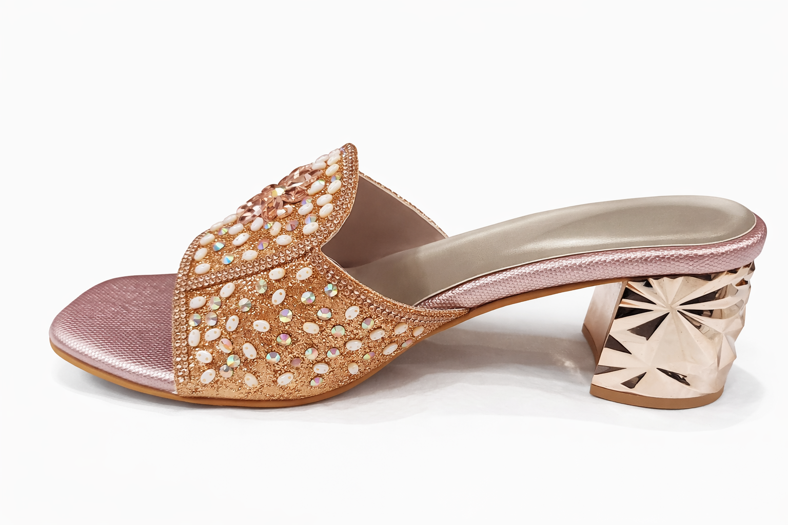 Add a touch of refined glamour to your ethnic and festive wardrobe with these elegant ladies’ block-heel mule sandals. Designed in a soft blush-pink and rose-gold tone, the wide front strap is richly adorned with intricate beadwork, crystal accents, and a striking floral centerpiece that instantly elevates the look. The subtle shimmer of the textured footbed complements the embellishments beautifully.Featuring a stylish geometric-patterned block heel, these sandals offer both stability and comfort, making them perfect for long wear. The slip-on mule design ensures ease, while the cushioned insole provides all-day comfort. Ideal for weddings, festive celebrations, parties, and special occasions, these heels pair effortlessly with sarees, lehengas, gowns, and Indo-western outfits.