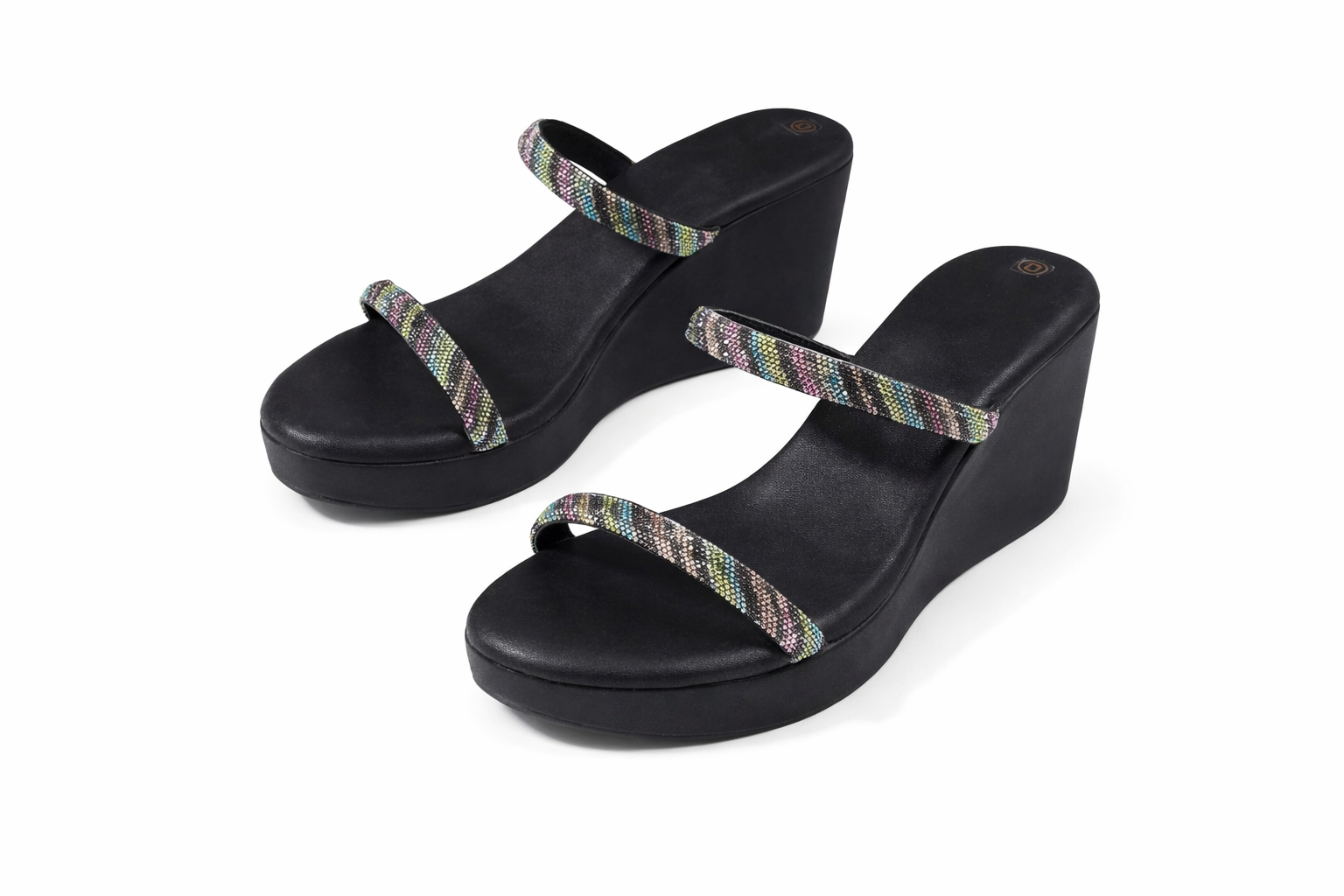 Colour: Black with multicolour rhinestonesHeel Type: WedgeStyle: Open toe, slip-on