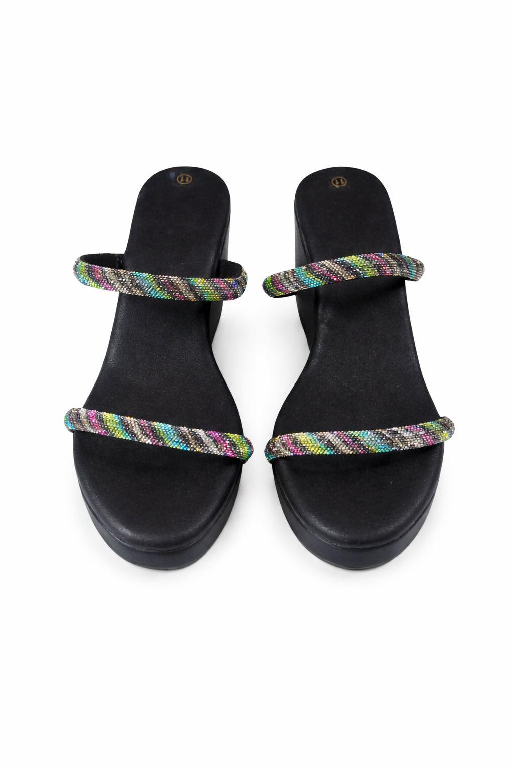 Step into effortless glamour with these elegant black wedge sandals, designed for comfort and sparkle. Featuring a sleek cushioned footbed and a sturdy wedge heel, these sandals are highlighted with multicolour rhinestone straps that add a subtle shimmer to every step. Perfect for festive wear, parties, evening outings, or pairing with ethnic and western outfits.